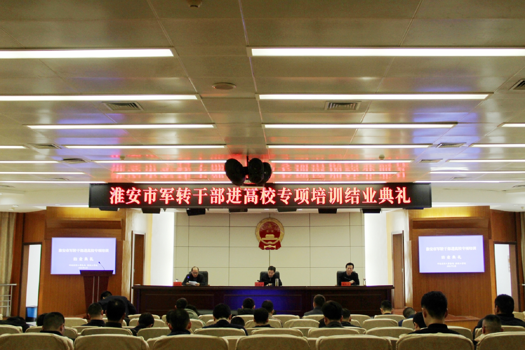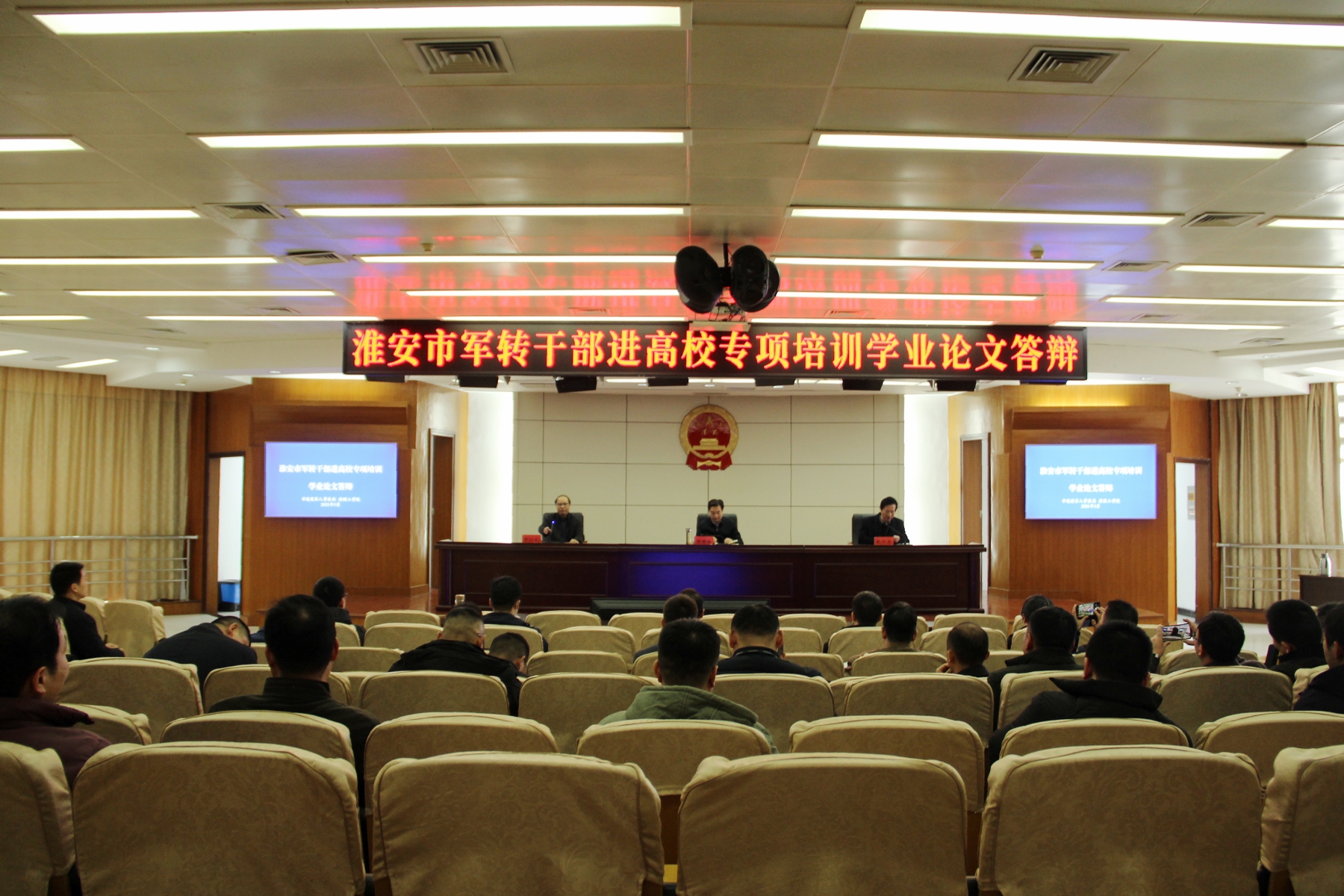 3月13日,2020年军队转业干部进高校专项培训学业论文答辩暨结业典礼在淮安市退役军人事务局第一会议室举行。淮安市退役军人事务局局长陈继业、副局长张怀兵,我校商学院教授朱至文、管工学院教授刘长平、人文学院教授陈明、建工学院教授周潮,参训的军转干部及继续教育学院有关人员参加典礼。学业论文答辩暨结业典礼仪式由继续教育学院院长许仁良主持。