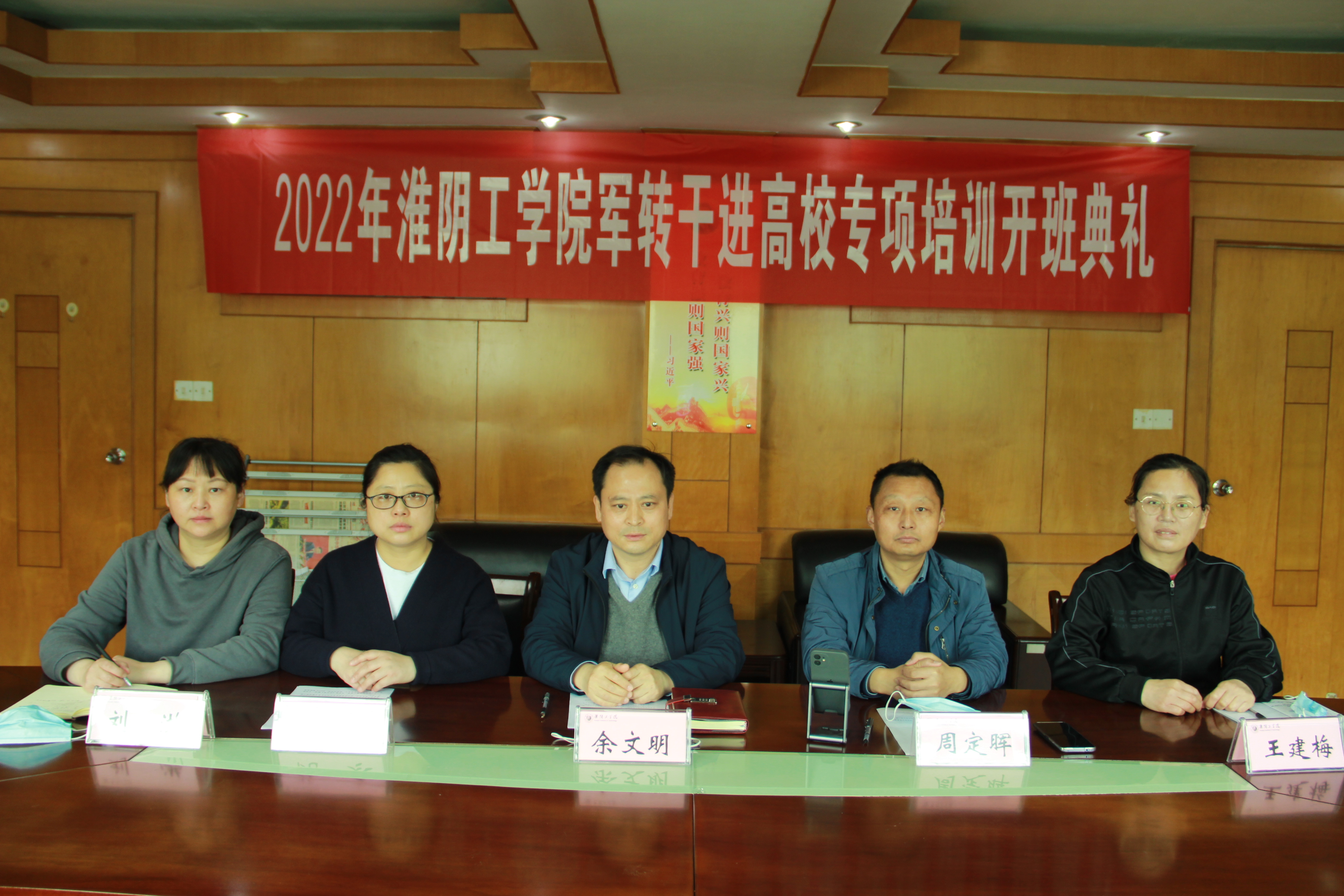 余文明代表学校对2022年专项培训学员表示诚挚的祝贺和热烈的欢迎。他指出,淮阴工学院是具有鲜明应用型特色的省属本科院校,是硕士学位授予单位,始终坚持用周恩来精神办学育人,对推动形成淮安“双循环”的新发展格局起着重要支撑作用。学校拥有丰富的教学资源、高水平的师资队伍,并且高度重视军转干部进高校专项培训工作。他对参训学员提出三点希望:一要珍惜机会,更加努力进取。要珍惜家人的重托、组织的期待和学校的声誉,扎扎实实学习;二要注重学以致用,不断再创佳绩。紧密结合工作实际,以问题为起点,进行专业知识体系的学习和创新思维方法的训练;三要严格行为规范,树立良好风尚。严格遵守校纪校规,树立革命军人高尚风范,养成刻苦学习、严守纪律、自我约束的良好风尚。