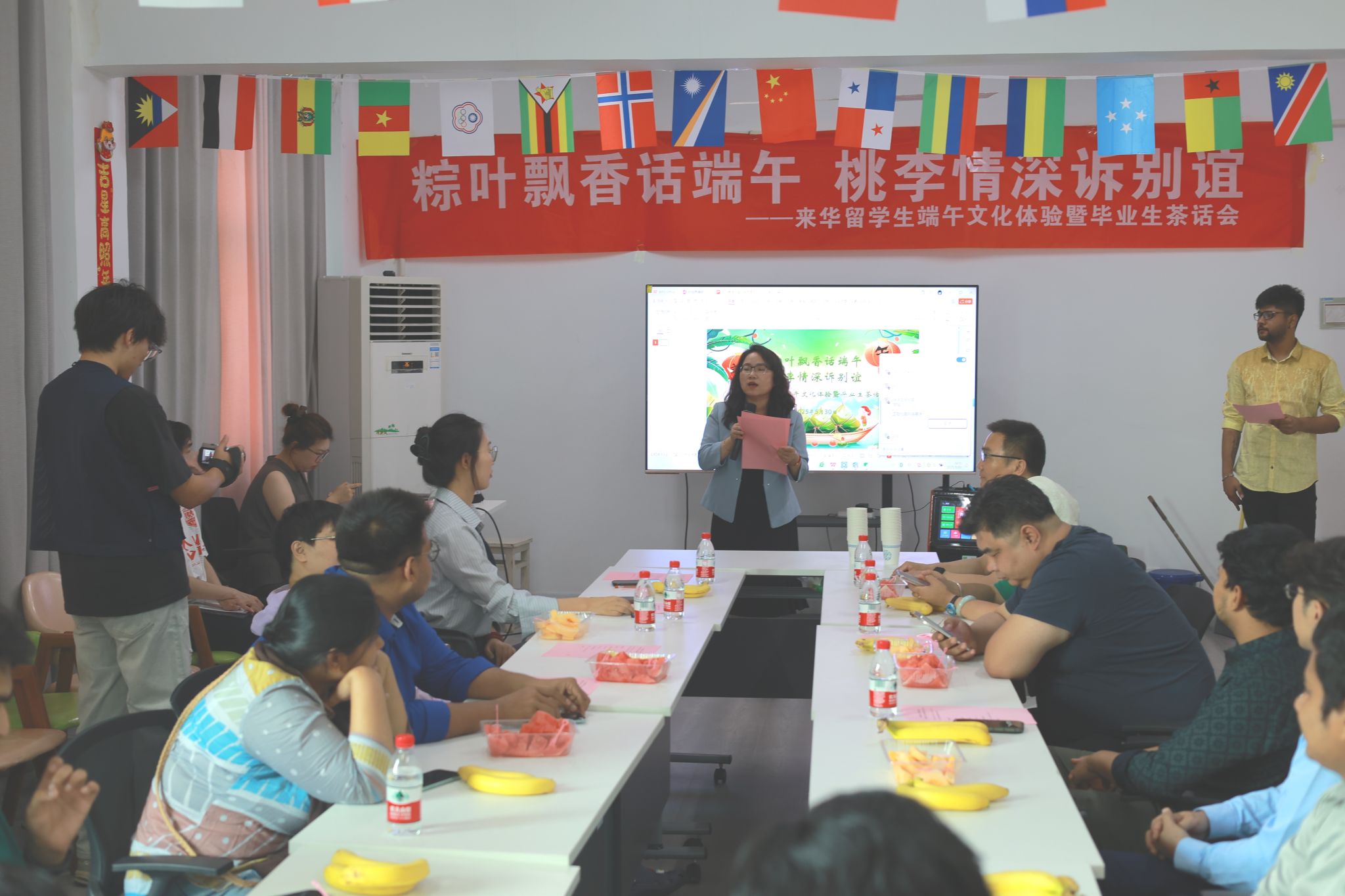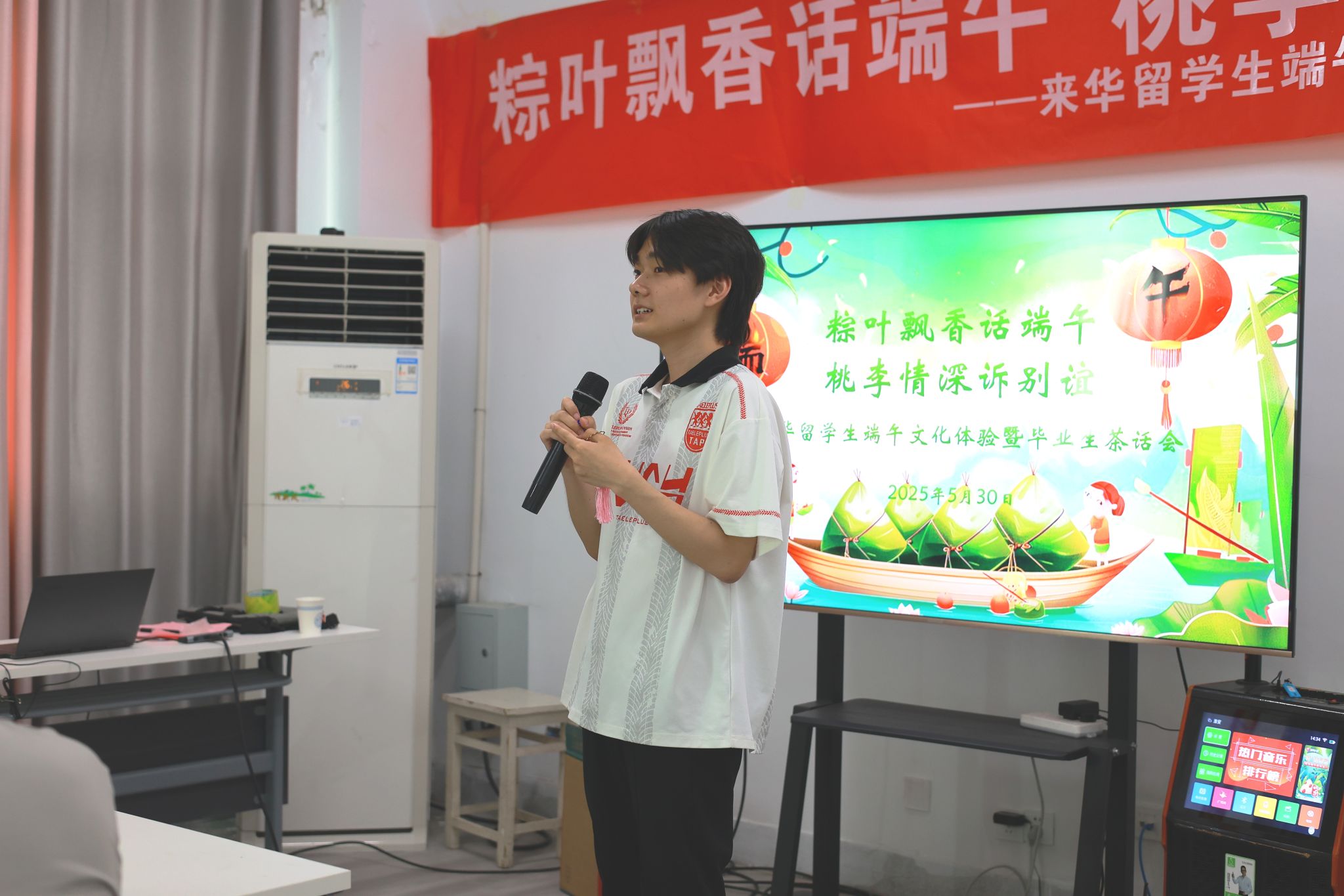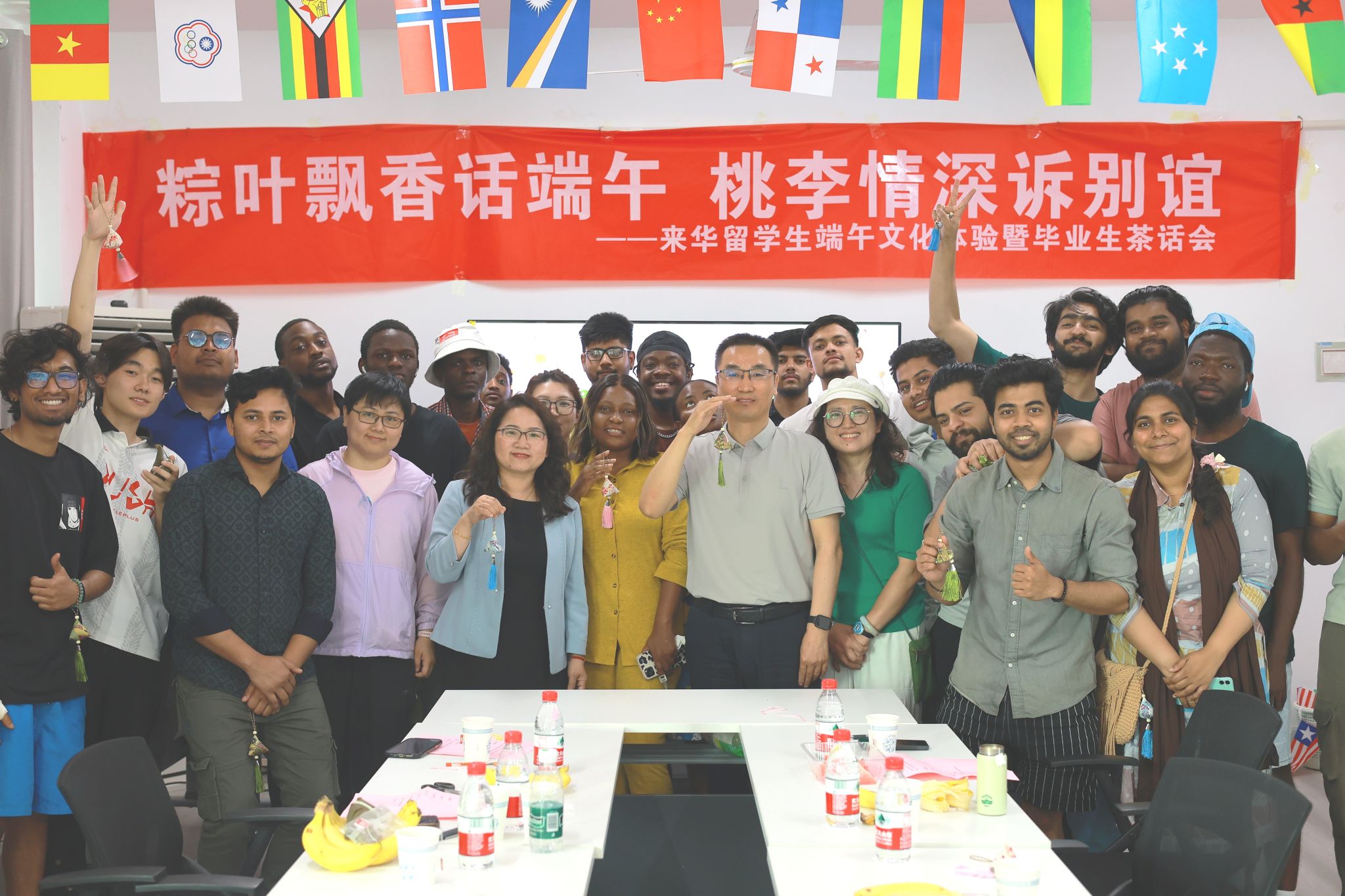 5月30日下午,淮阴工学院北京路校区明德楼留学生活动室内,以“粽叶飘香话端午,桃李情深诉别谊”为主题的2025年端午文化体验暨来华留学生毕业生茶话会在此温馨启幕。国际教育学院院长刘玉君、副院长胡庭树,校党委宣传部马庭婷老师与来华留学生们齐聚一堂,共度一段充满文化韵味与离情别绪的美好时光。