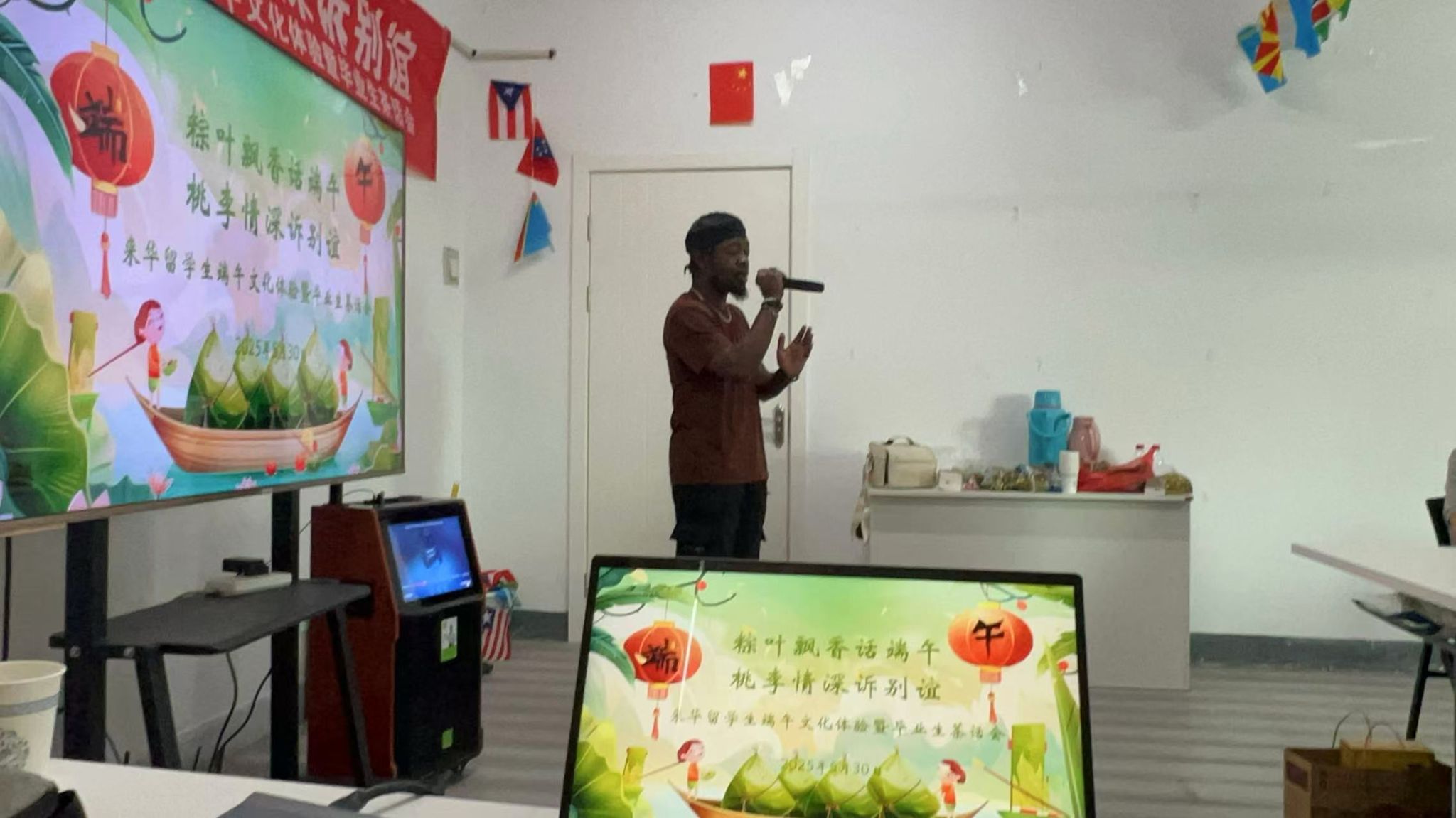 外国语学院翻译专业学生沈雨轩向留学生详细介绍了端午节的起源、习俗。从屈原的故事到赛龙舟、吃粽子、挂香囊等传统活动,留学生们听得津津有味,对中国这一重要传统节日有了更深入的了解,也被中华文化的源远流长深深吸引。