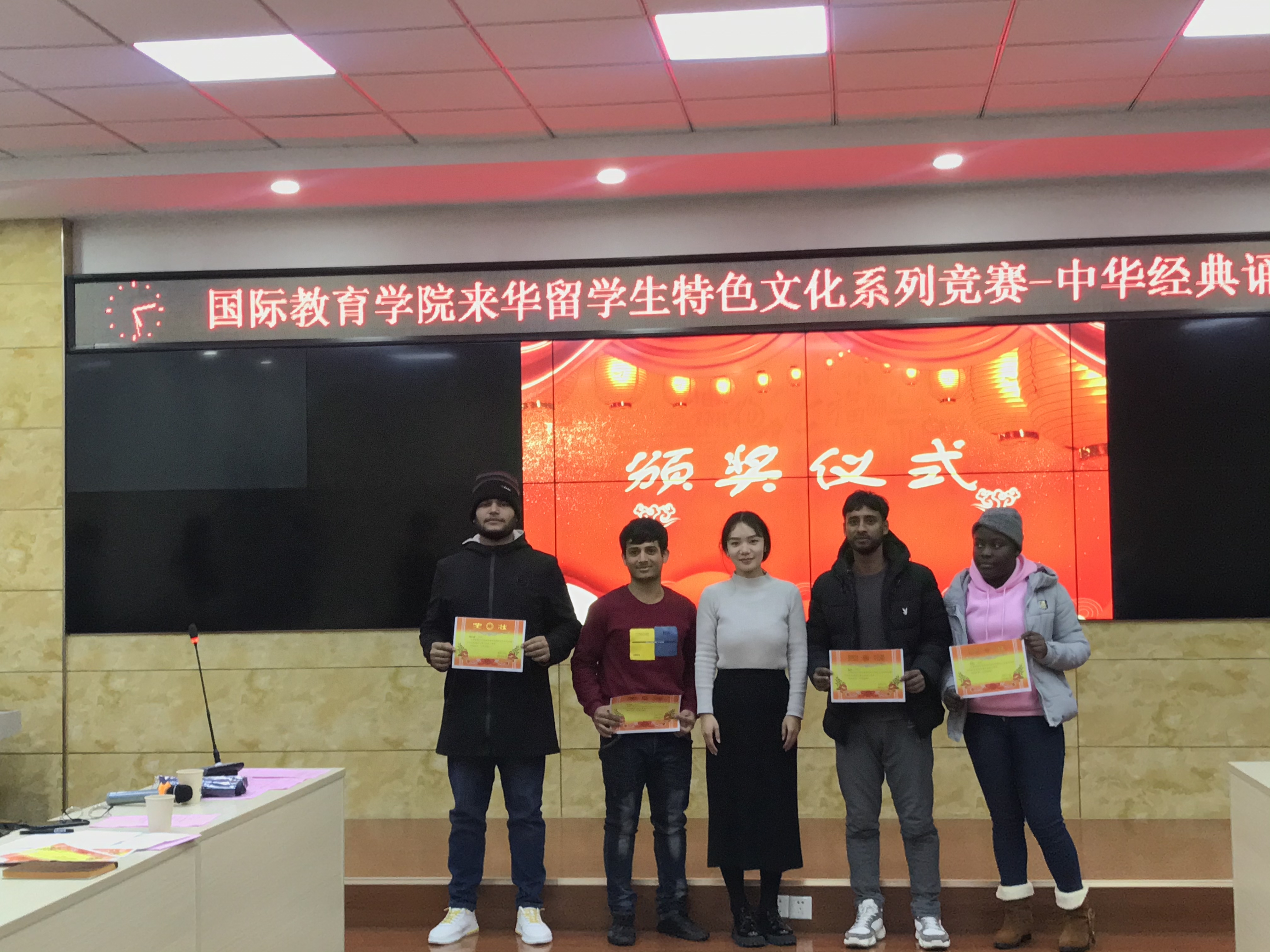 12月12日上午,国际教育学院来华留学生特色文化系列竞赛之中华经典诵读大赛于逸夫楼可视化中心教室圆满举行。此次比赛邀请了教务处处长赵玉萍、国际教育学院院长徐晓梅、外国语学院副院长孙建光和国际教育学院副院长郁敏担任评委,国际教育学院教师郑淑娟担任主持人。