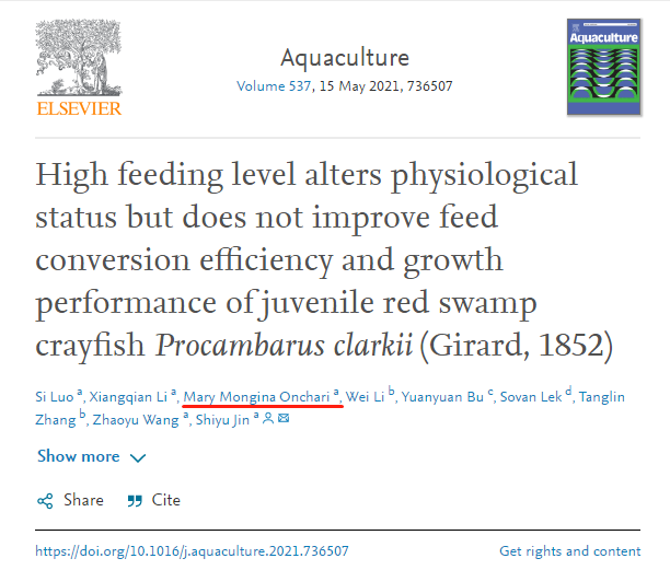 近日,来自淮阴工学院江苏省益生制剂重点实验室、中科院水生生物研究所淡水生态学研究中心、法国图卢兹联邦大学生物进化与多样性等实验室的联合研究团队发现在克氏原螯虾(小龙虾)的大规格苗种培育过程中,饲料的高水平投入(6%BW/day)不利于提升小龙虾的生长性能和饲料利用效率,相关成果发表在水产领域SCI顶级期刊AQUACULTURE上。该论文第三作者为我校2017级生物工程专业留学生玛丽(MARY MONGINA ONCHARI,国籍:肯尼亚)。