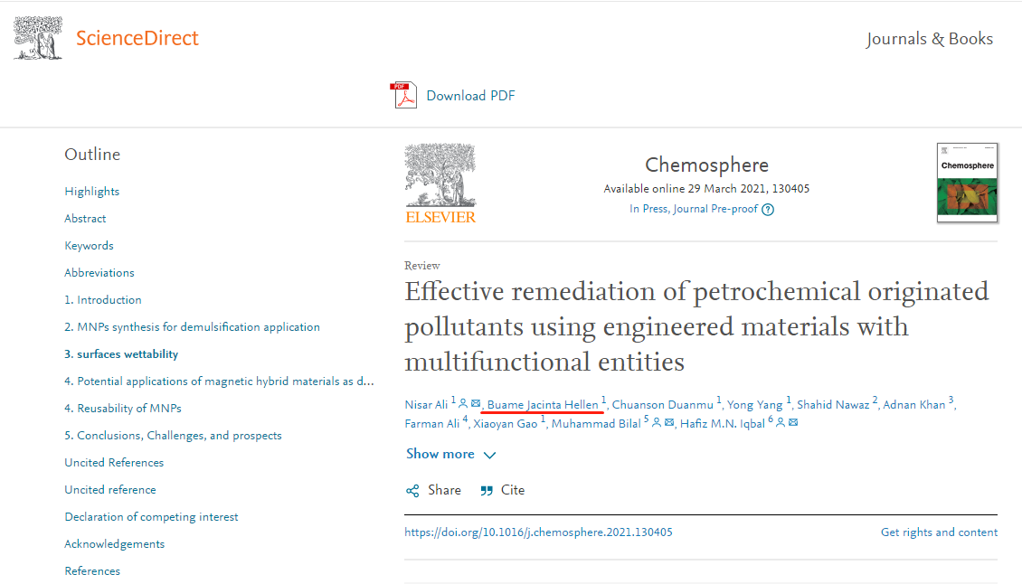 近日,我校2017级制药工程专业加纳籍留学生海伦(BUAME JACINTA HELLEN)以论文第二作者在环境科学领域SCI期刊CHEMOSPHERE(JCR Q1,中科院2区)上发表文章《Effective Remediation of Petrochemical Originated Pollutants Using Engineered Materials with Multifunctional Entities》 (多功能工程材料对石化污染物的有效处理)。文章综述了原油乳状液和烃类污染废水对环境的影响,并以实例说明了具有润湿性的智能高分子纳米结构材料对它们的有效处理,通过实例讨论了油水乳液高效分离的基本机理,并展望了智能材料的发展前景。