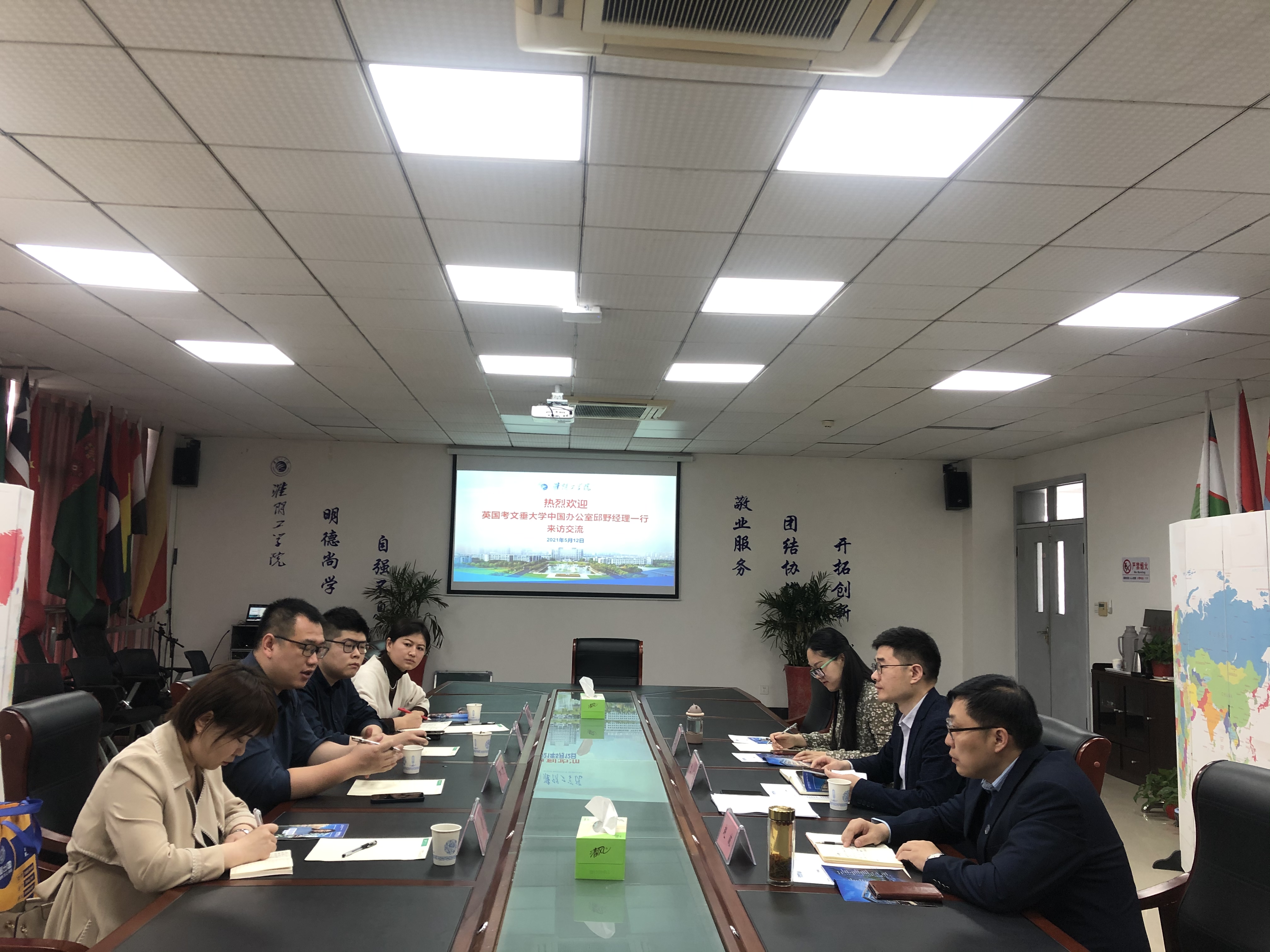 5月12日,英国考文垂大学中国办事处邱野经理一行来我校访问交流并洽谈车辆工程专业人才培养与合作。会议在枚乘路校区YF1203会议室举行,交通工程学院院长包旭、国际处副处长赵波参加会议。