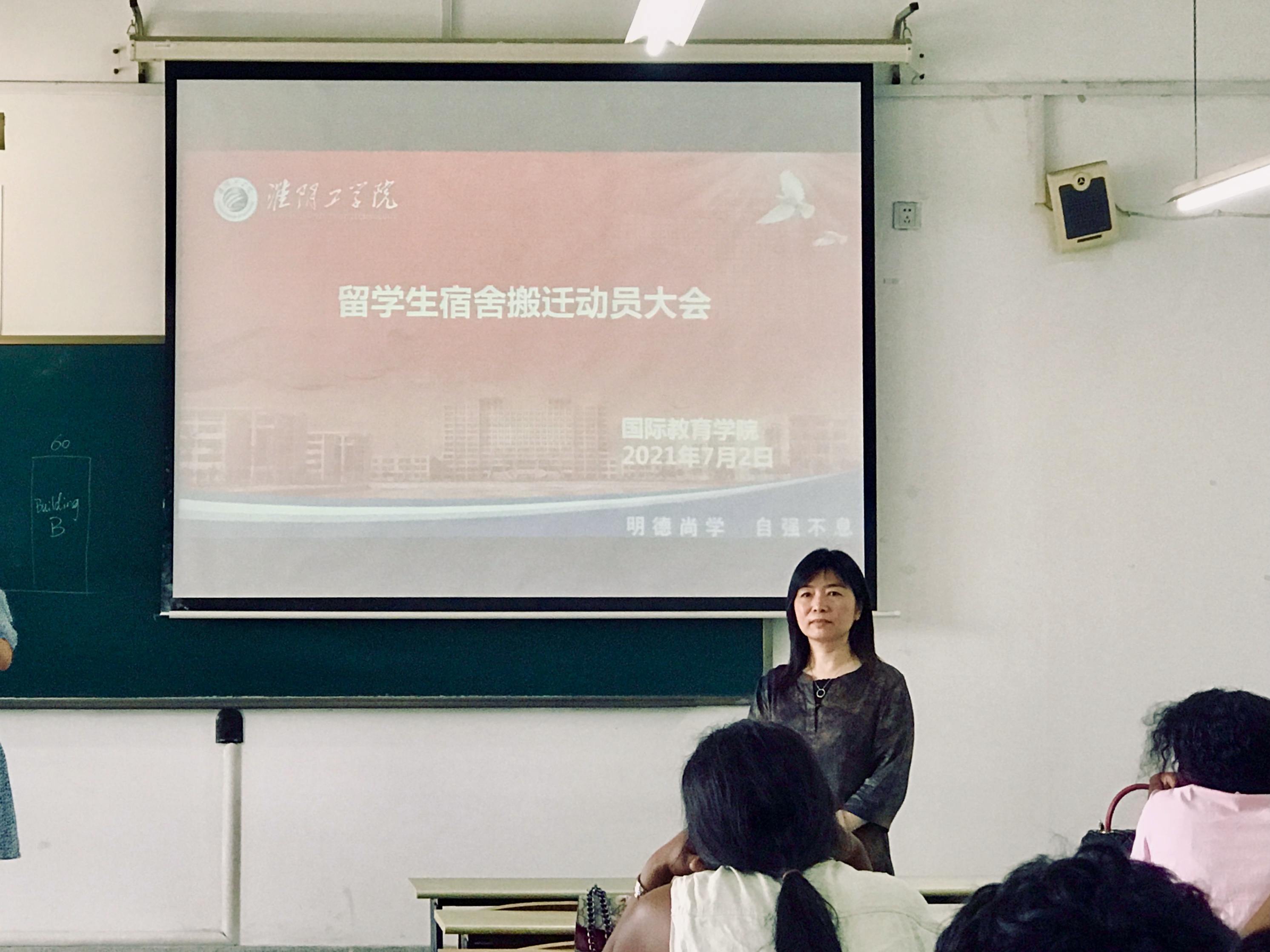 7月2日下午,国际教育学院在枚乘路校区逸夫楼204召开留学生宿舍搬迁动员大会。国际教育学院院长左进、副院长刘玉君出席了此次会议。