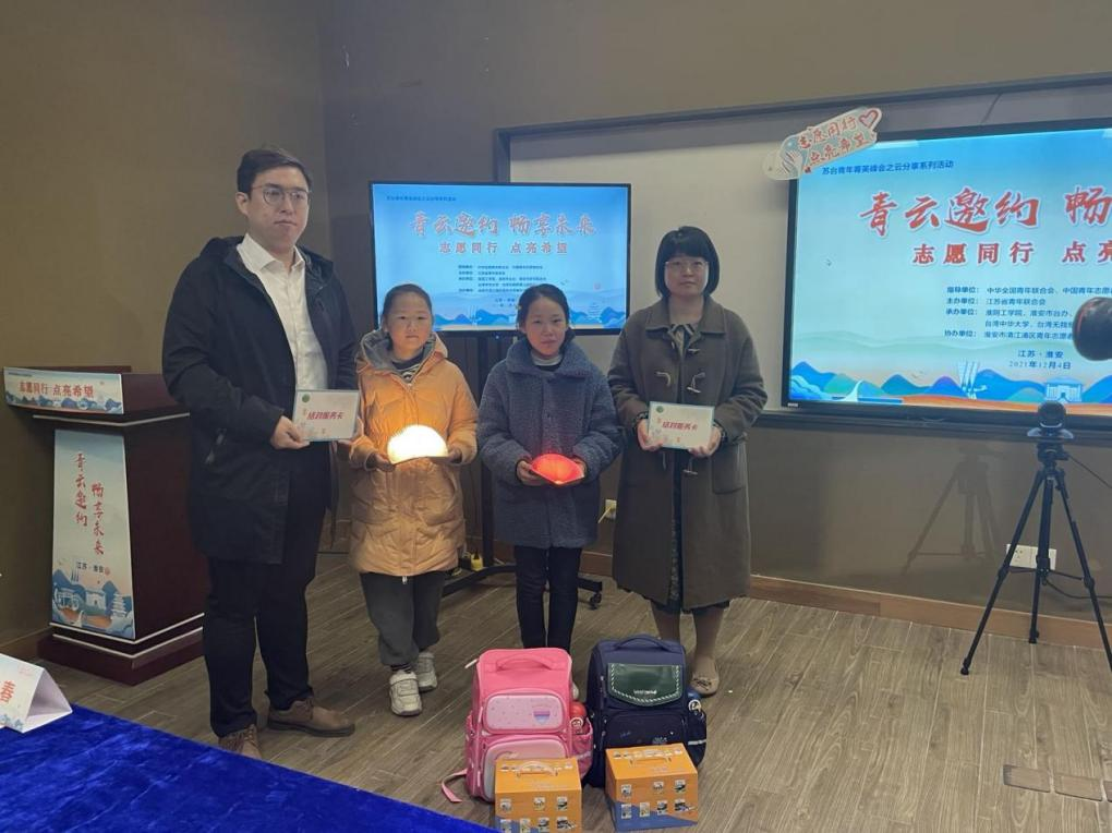 参与线下活动的台商学院台籍教师于立宸等在淮台青代表和市青联委员代表共同为4名困境儿童点亮“希望之灯”,并送上结对卡、图书等慰问品,用行动践行公益、用志愿点亮希望。