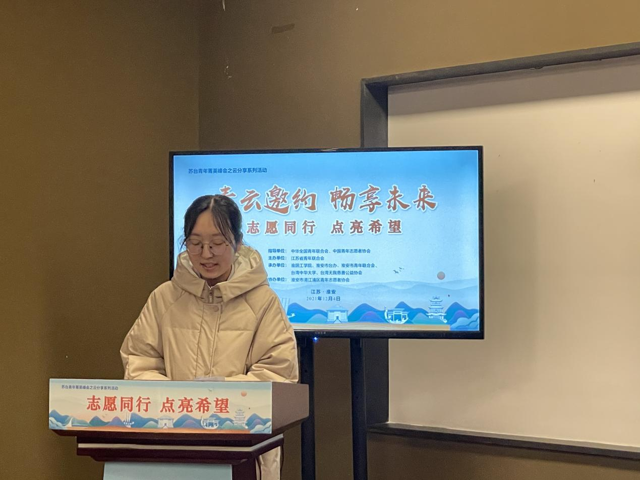 12月4日上午,由淮阴工学院、淮安市台办、淮安市青年联合会、台湾中华大学、台湾无我慈善公益协会联合承办的“志愿同行 点亮希望”--苏台青年菁英峰会之云分享系列活动,在我市知行空间举行。淮阴工学院港澳台事务办公室副主任、台商学院副院长赵波、共青团淮安市委副书记张飞、台湾地区中华大学国际暨两岸事务大陆事务组组长张燃珠、台湾无我慈善公益协会理事长潘柏铨,以及两岸青年志愿服务领域资深专家、青年志愿者代表等参加了此次活动。