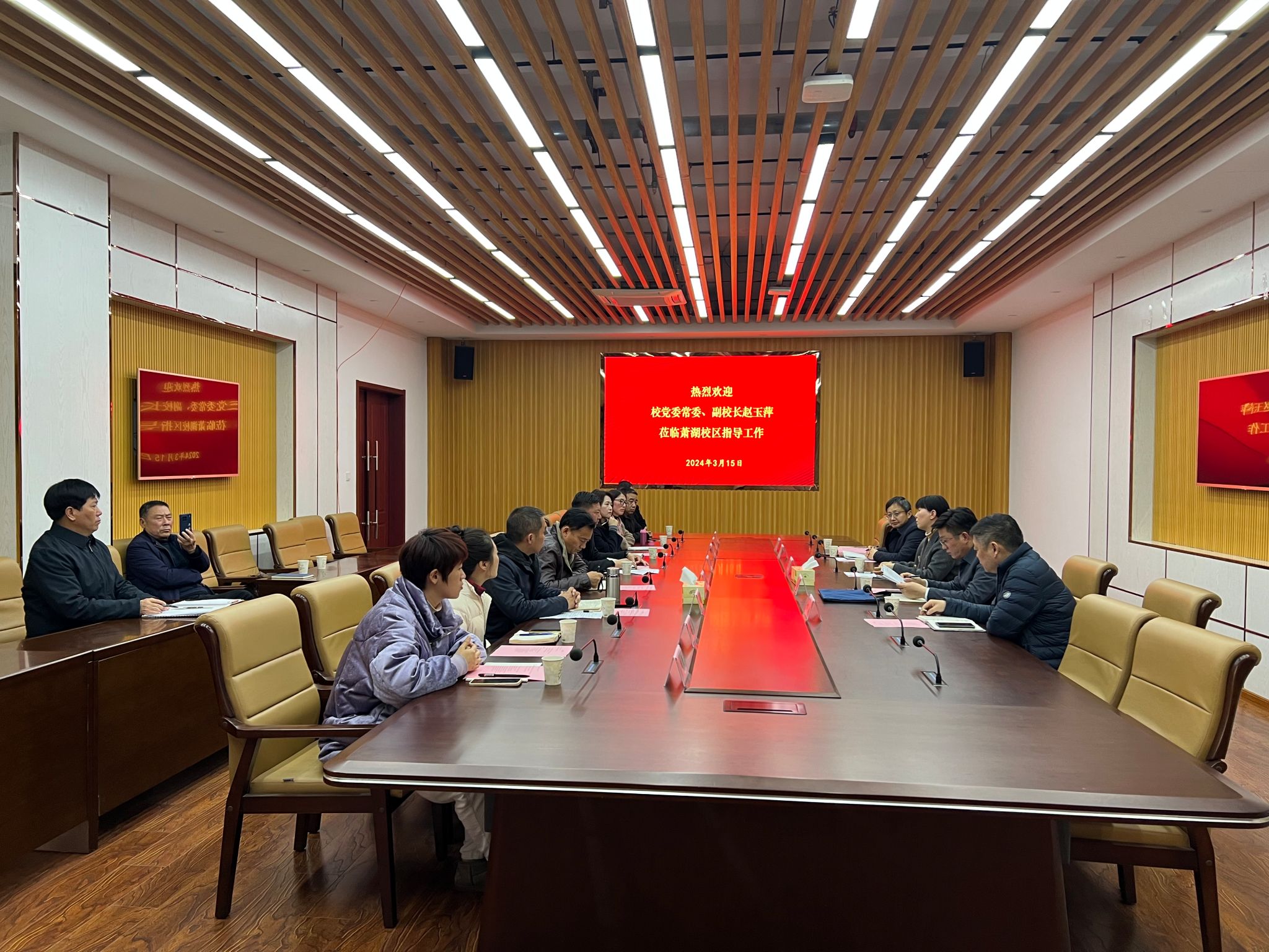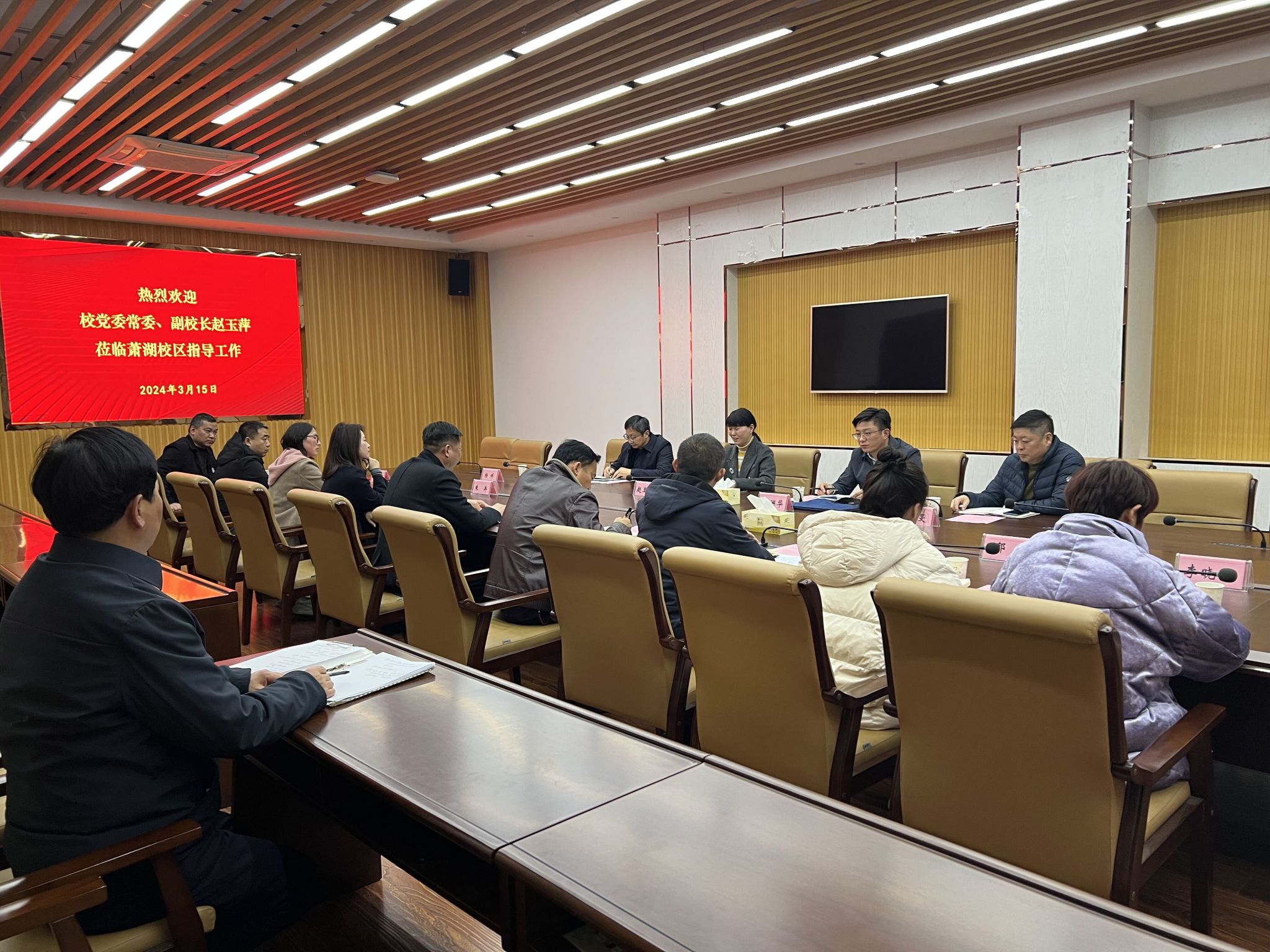 2024年3月15日下午,校党委常委、副校长赵玉萍莅临萧湖校区指导工作,并出席萧湖校区各经营网点负责人2024年工作研讨会。会上萧湖校区管委会副主任(主持)陈洪华汇报工作,各经营网点负责人交流发言,共同磋商如何更好地服务萧湖师生。
