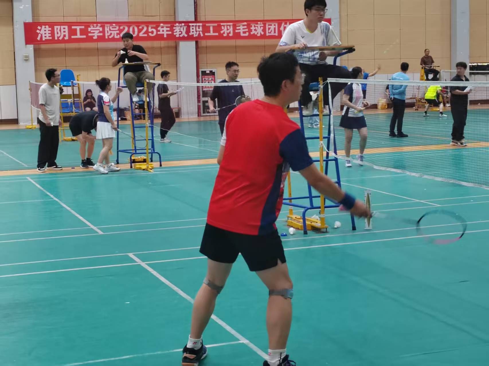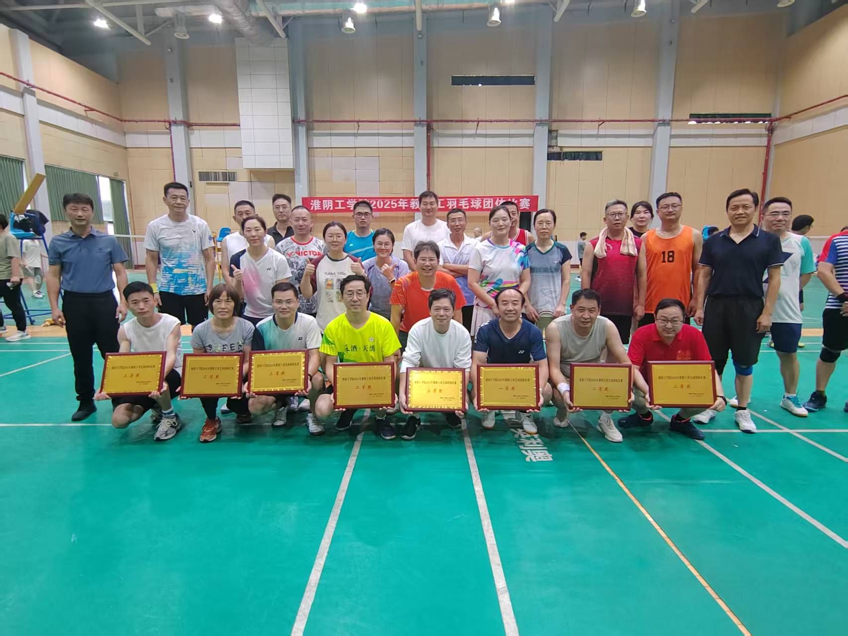 9月20日下午16时许,伴随着决赛场上商学院代表队的混双选手赢得最后一分,淮阴工学院2025年教职工羽毛球团体比赛圆满落下帷幕。最终商学院代表队获得冠军,机关三代表队获得亚军,机关二、实训中心联合代表队获得季军,外国语代表队、交通化工联合代表队、机关一代表队、建工学院代表队、电信学院表队获得四到八名。