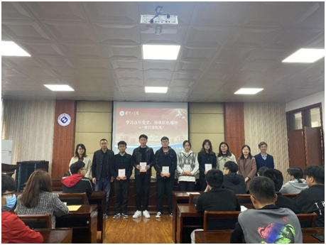 4月23日下午机械与材料工程学院开展 “学习百年党史,传承红色精神”——赠送党史书籍活动,参与此次活动的有学院党委副书记王明霞、校学生处资助中心蒋丹丹、机材学院辅导员罗泽如、施丽萍、国家奖学金和国家励志奖学金获得者代表,本次活动由学工办主任郁大同主持。