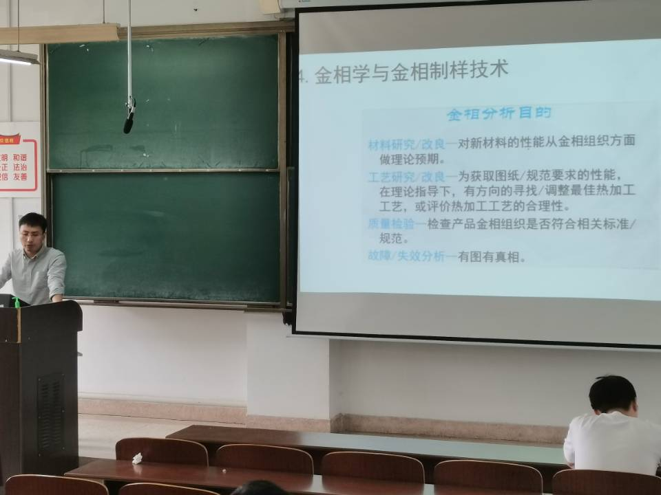 讲座伊始,张秋阳老师向我们介绍了全国大学生金相技能大赛的由来、赛徽以及在全国各大类比赛中的地位,着重强调金相大赛已经成为材料类专业规格最高、制度最健全、覆盖面最广、影响力最大的一项赛事。随后,张秋阳老师向同学们详细地讲解了有关金相学与金相制样的技术,并用实例说明了球墨铸铁在金相制样中的技巧——怎样把球磨铸铁的石墨形状腐蚀出来,什么是石墨的最佳状态。