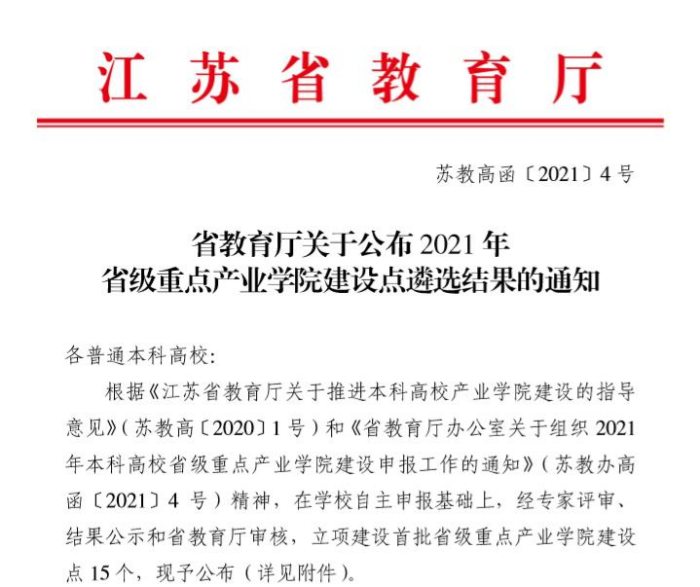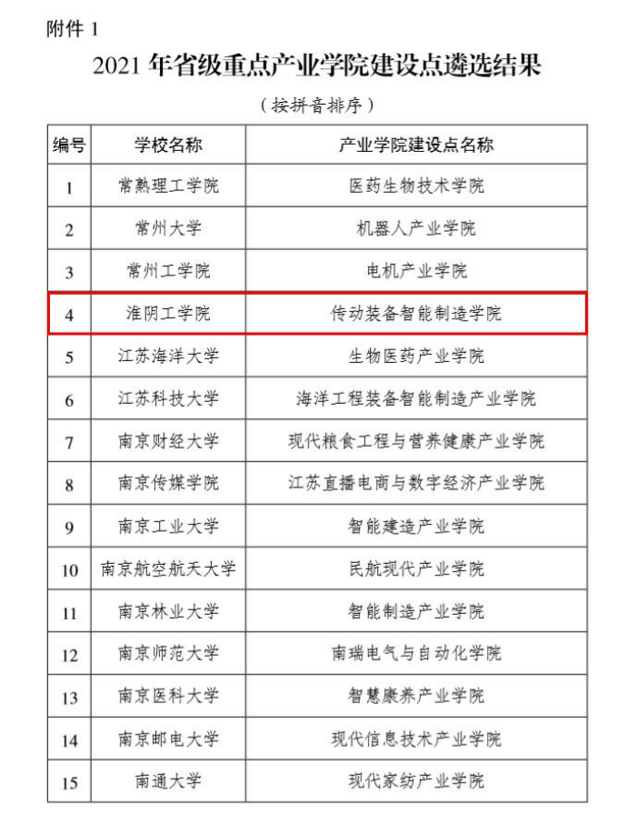近日,江苏省教育厅发布了《省教育厅关于公布2021年省级重点产业学院建设点遴选结果的通知》,我院申报的“传动装备智能制造学院”成功获批,成为江苏省2021年度立项的15个省级重点产业学院建设点之一。