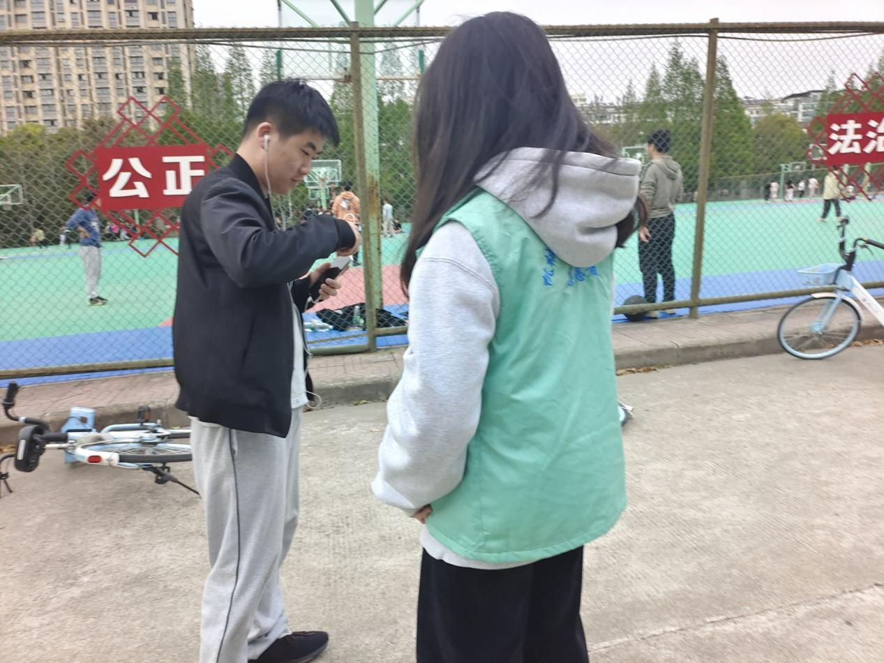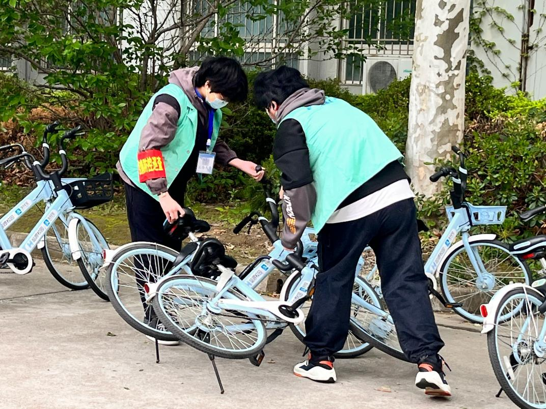除了疫情防控工作,志愿者们还就近整理摆放杂乱的自行车,使校园更加干净整洁,减轻后勤人员的工作压力。