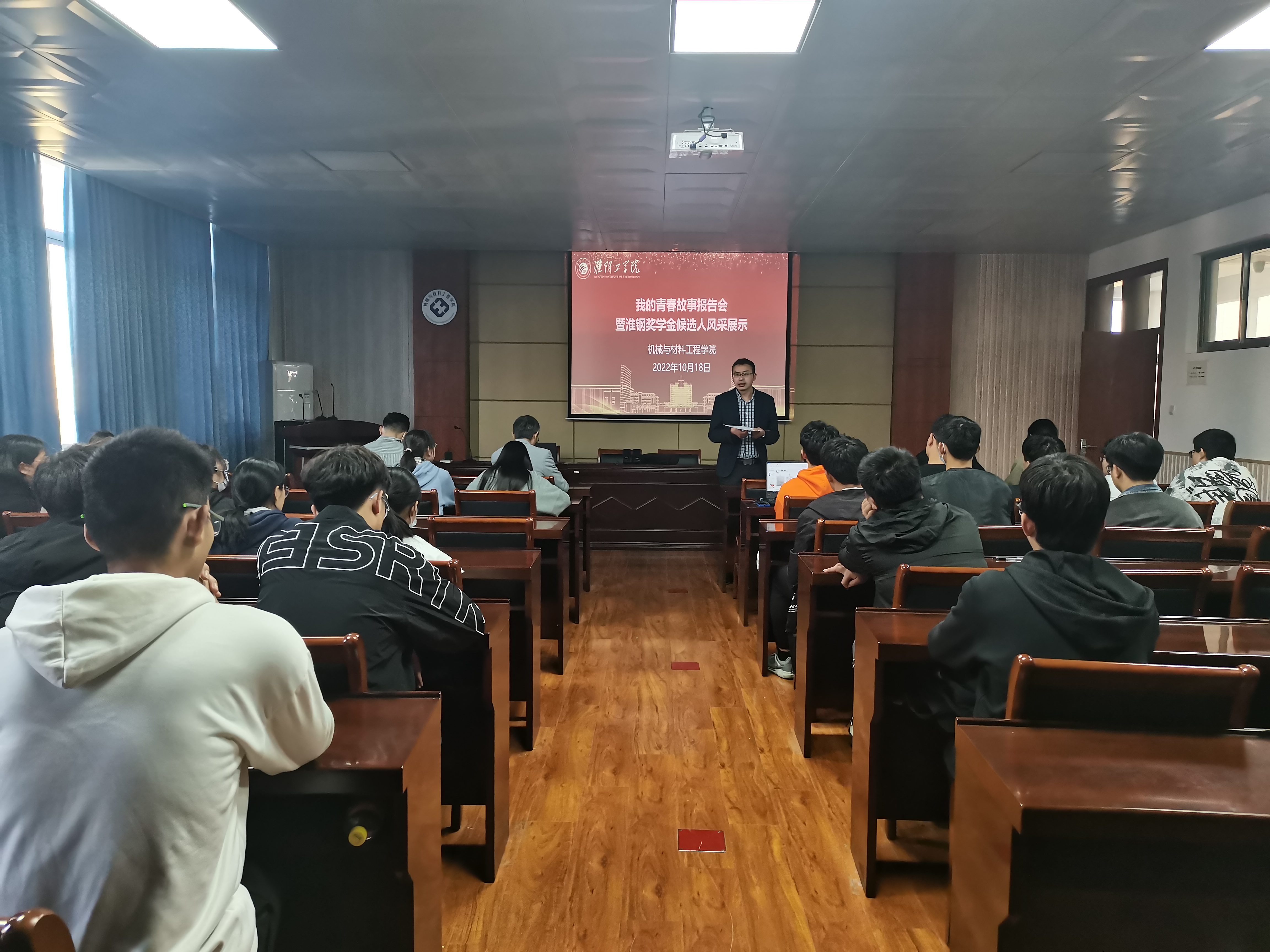 10月18日下午16:00,机械与材料工程学院在15401开展我的青春故事报告会暨淮钢奖学金候选人风采展示活动,院学工办主任郁大同,辅导员罗泽如、郭巧会和朱天明担任评委,10名淮钢奖学金候选人和2022级新生代表参加了此次报告会。