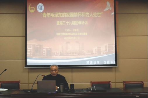 11月17日晚7:00,机械与材料工程学院在15401开展“青年毛泽东的家国情怀和为人处世”信仰公开课暨第二十九期团课第六讲。学院关工委副主任徐亚洲老师主讲,各年级优秀共青团员共计85人参加了本次团课培训。