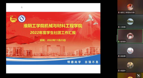 为规范学生社团活动管理,11月23日,机械与材料工程学院在腾讯会议开展2022年学生社团工作汇报会。机材学院党委副书记王明霞、辅导员朱天明、各学生社团社长、学生会主席团成员以及各部门部长参加了这次会议。