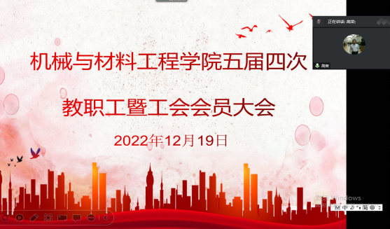 2022年12月19日下午2:30,机械与材料工程学院五届四次教职工暨工会会员大会顺利召开,会议全程采用线上方式进行,由学院党委副书记王明霞主持,学院领导班子成员和全体教职工出席。