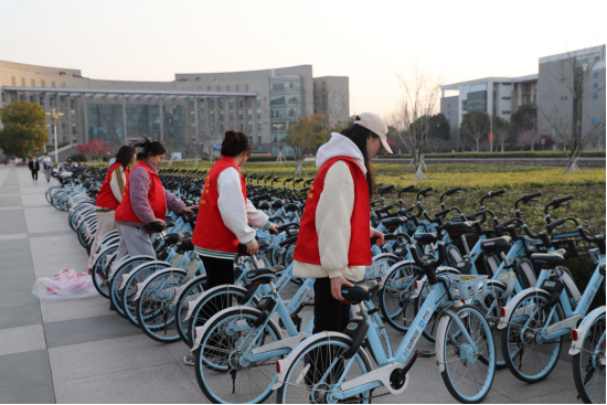 由于校园中自行车使用频率高,时常出现自行车摆放不到位,妨碍交通出行等问题。机材学院小红帽志愿者们,及时整理校园散乱车辆,保持校园的文明清洁。