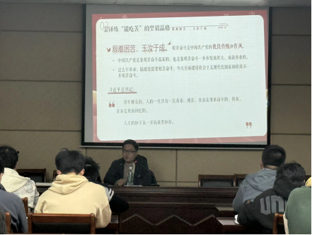 王云飞以梁启超《少年中国说》启幕,引导学生思考新时代使命,并围绕“有理想、敢担当、能吃苦、肯奋斗”展开阐述:他借马克思与青年毛泽东的范例,强调青年应将个人理想融入民族复兴的中国梦;深入剖析责任内涵,要求团员以担当精神履行职责;重新定义“吃苦”为成长的宝贵财富,鼓励在攻坚克难中锤炼品格;最后指出奋斗是青春底色,号召大家将信念化为行动,以专业学习、社会实践和服务群众践行初心,在实干中书写无悔青春。