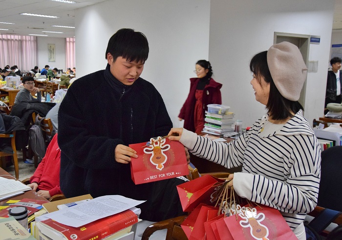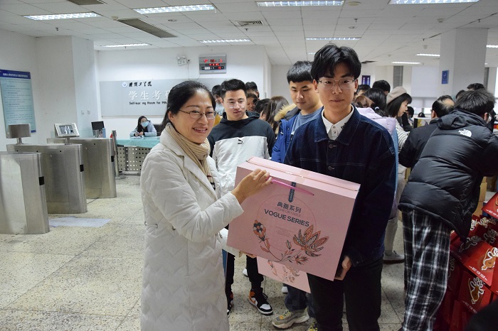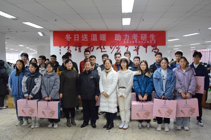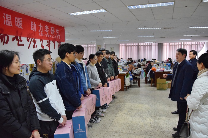 随后,学院领导为考研学子分发牛奶、毯子、礼盒等慰问品,送上祝福。