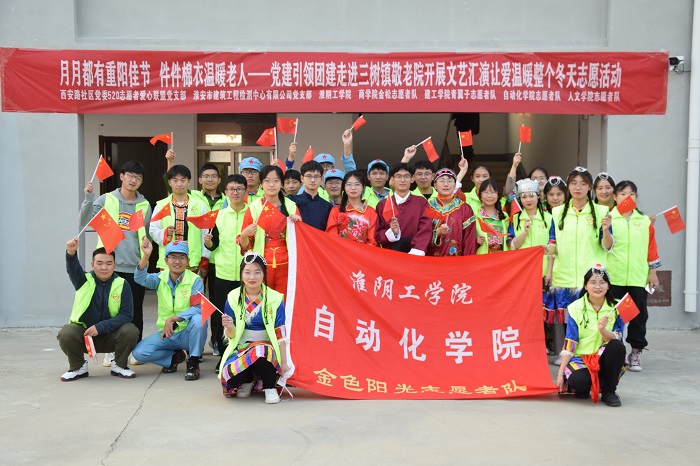 10月30日,自动化学院金色阳光志愿者队走进淮安市淮阴区三树镇敬老院,联合淮安市5·20志愿者爱心联盟等团体共同开展“月月都有重阳佳节 件件棉衣温暖老人”主题文艺汇演志愿活动。本次活动旨在丰富敬老院老人的精神生活,教育引导青年学生关爱老人、尊敬老人,身体力行的同时,传承优秀的中华民族传统美德。