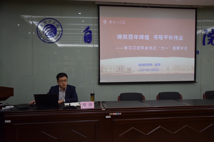 11月2日晚,自动化学院党委书记郑洋,以《铸就百年辉煌,书写千秋伟业》为题,在笃行楼13509给入党积极分子讲授了一堂深刻生动的专题党课,宣讲习近平总书记“七一”重要讲话精神。