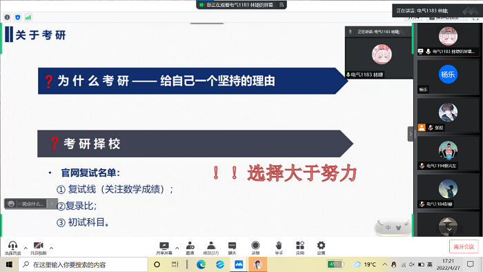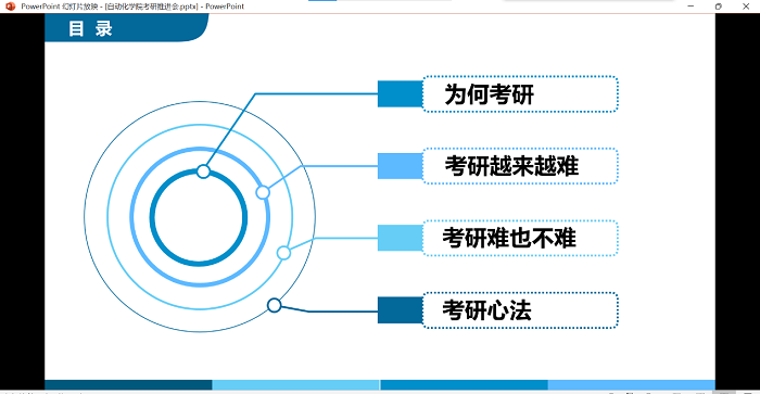 为提高2019级学生的考研热情,明确考研目标,深入了解考研过程中的问题,解决备考同学们的困惑,4月27日下午三点半,自动化学院在13509以线上线下相结合的方式举行2019级考研工作推进会。学院党委副书记杨晶和辅导员张文博出席本次会议,同时邀请到数理学院郭云老师及18级考研已录取同学代表作考研指导及经验分享。
