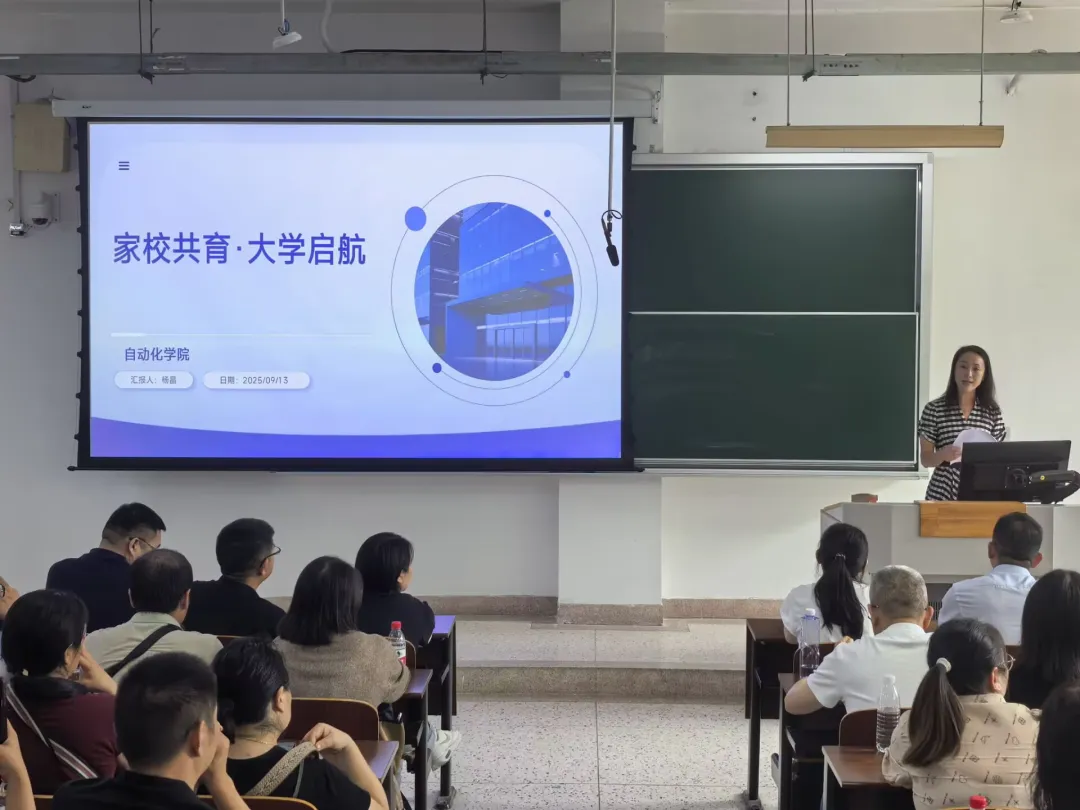 会议在温馨热烈的氛围中拉开帷幕。贾笑颖老师首先代表学院对各位家长的到来表示热烈欢迎和衷心感谢,并简要介绍了会议流程和与会领导老师。学院党委书记孙全平在致辞中向家长介绍了学校的办学理念和学院的文化底蕴,强调家庭教育与学校教育协同育人的重要性,希望家长与学院保持密切沟通,共同关注学生的全面成长。随后,院长赵环宇从学院历史、学科建设、师资力量、专业特色和发展前景等方面,详细介绍了自动化学院的办学优势和人才培养体系,帮助家长更加直观地了解学生未来的学习环境和发展方向。学院党委副书记杨晶则围绕学业要求、学生管理、生活服务、心理健康支持等方面,系统介绍了学院的学生成长支持体系,展示了学院在促进学生全面发展方面的多项举措和保障机制。在最后的家长答疑环节,与会领导与班主任老师就家长关心的学业规划、生活适应、就业前景等问题进行了耐心细致的解答,现场互动踊跃,气氛融洽。