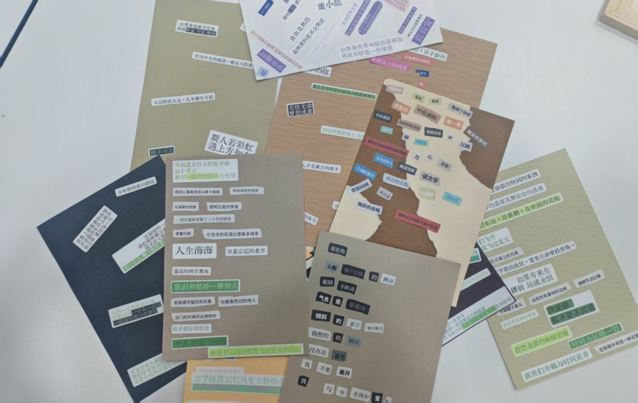 随着剪刀的轻响,一张张印有不同词句的纸片被精心挑选、裁剪、排列。同学们将“理想”与“前行”拼接,诉说逐梦的坚定;用“温柔”与“自愈”组合,传递与生活和解的力量;更有同学融入专业元素,让“代码”与“星光”碰撞,赋予诗作独特的学科韵味。在文字重组的过程中,积压的压力悄然释放,潜藏的心事逐渐明晰,每一首拼贴诗都成为最真实的心灵独白。
