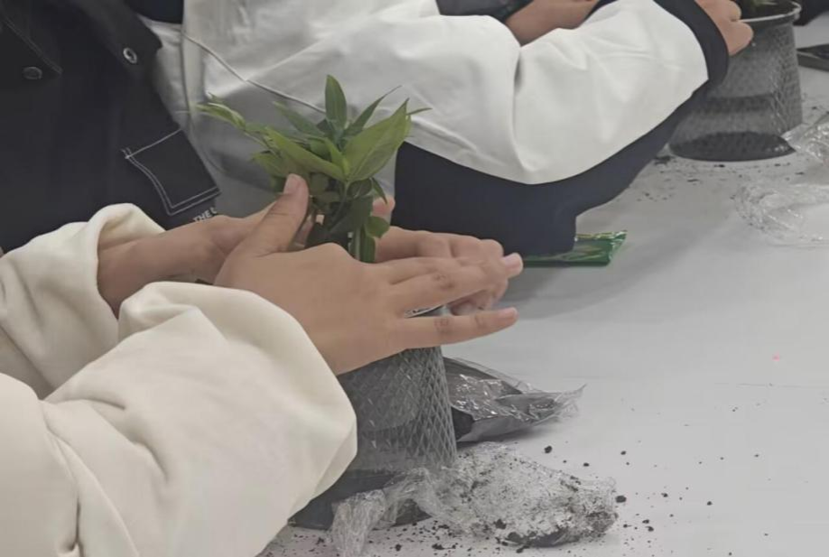 随着小铲子的翻动,一盆盆充满生机的绿植在同学们手中逐渐成型。有人选择生命力顽强的多肉,寄托“坚韧生长”的期许;有人栽种清新雅致的绿萝,象征“平和从容”的心境;更有同学融入创意巧思,给花盆贴上刻有专业术语的贴纸,让“代码”与“绿意”共生,赋予盆栽独特的学科印记。在培土浇水的过程中,浮躁的情绪悄然平复,内心的焦虑慢慢消散,每一盆绿植都成为亲手浇灌的希望载体。