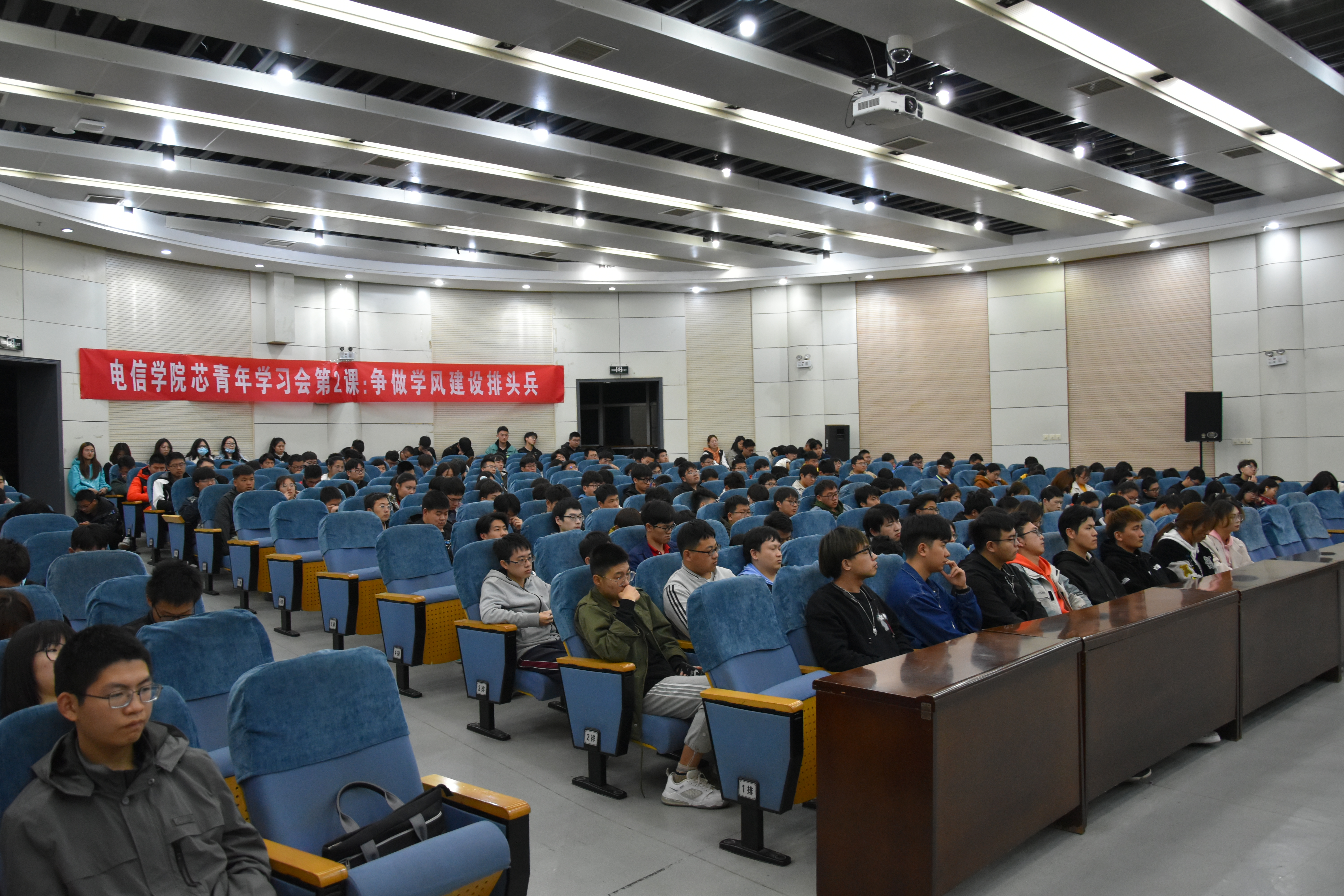 2021年4月14日18:30,电信学院在南苑图书馆报告厅开展芯青年学习会第二课:争做学风建设排头兵。学院党委书记韩飞、辅导员缪航、德航保研机构王健、优秀学生代表王心怡及2019级全体学生参加了本次活动。