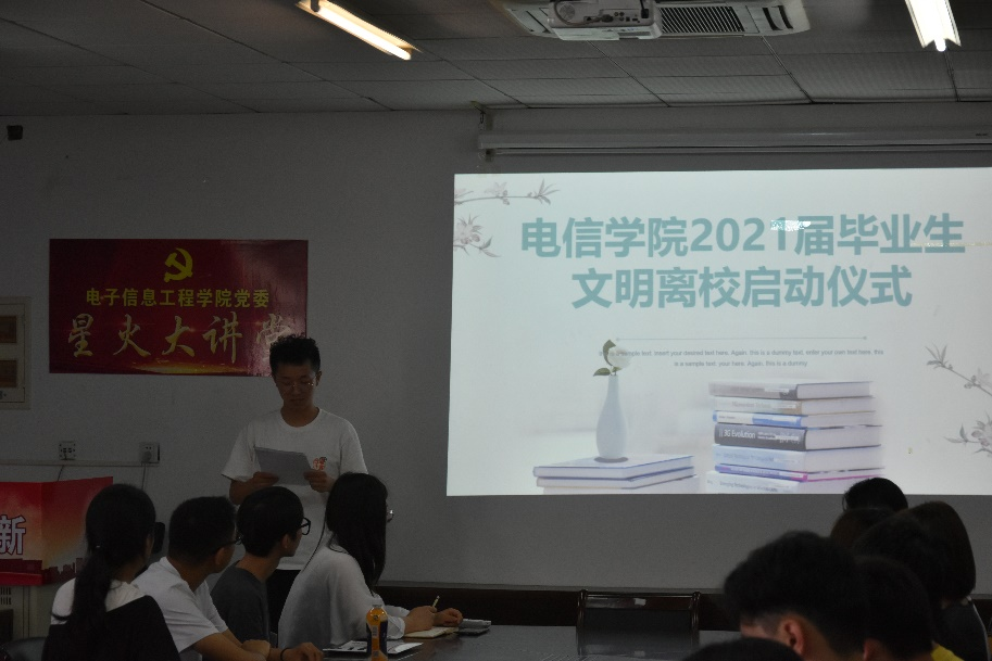 6月11日9:00,电信学院2021届毕业生文明离校启动仪式在yf1103顺利召开,电信学院党委书记韩飞、学工办副主任朱艳玲及学生代表参加活动。