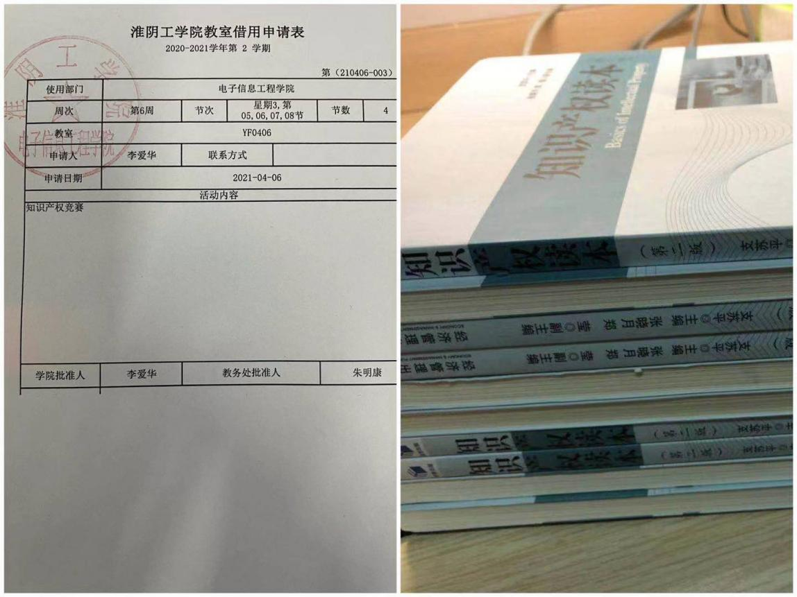 该竞赛以纪念4.26国际知识产权日为宗旨,分为4月7日校内选拔赛和4月11日的江苏省知识产权知识竞赛复赛。为组织好淮阴工学院知识产权校内选拔赛。于赛前一周完成好活动策划案,并根据活动要求,提前在线上发布通知,并且对知识产权进行宣讲。根据第五届江苏省大学生知识产权知识竞赛的大纲要求,提前对指定书目(知识产权读本第二版)进行采购,并且由发明协会会长单独出好竞赛试卷,秉持公平公正的原则,做好试卷的保密工作。