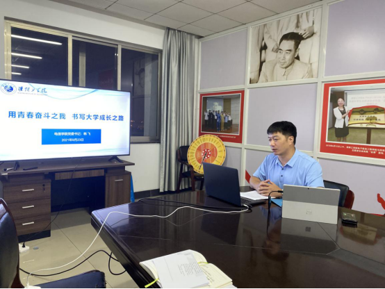 2021年9月23日19:00,电信学院芯青年学习会第二十课“用青春奋斗之我 书写大学成长之路”暨新生“云端思政课”第六讲于“腾讯会议”平台线上开讲,学院党委书记韩飞主讲,2005级校友吴琼,2016级校友周世杰为新生送上云寄语。