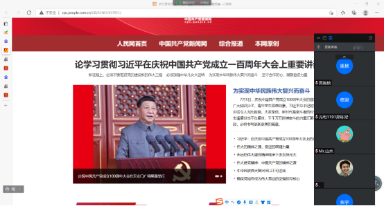 专题学习会前,各支书将习近平总书记“七一”讲话内容分享支部群,请同学们线下自学。学习会上,团支书详细讲解习近平总书记讲话的重要内涵,请邀请同学们分享学习感悟。电信1201班长卜苏阳在学习感悟中谈到“总书记在讲话中再次寄语青年‘要以实现中华民族伟大复兴为己任,增强做中国人的志气、骨气、底气,不付时代,不负韶华,不负党和人民的殷切期望’。为此,我感受到肩负的青春使命。我曾参加学院党委的‘红船从南湖起航’诗朗诵,简短的朗诵词确让我真切体会到从南湖到新中国成立的喜悦。我当加倍努力,志为党旗填光彩”。
