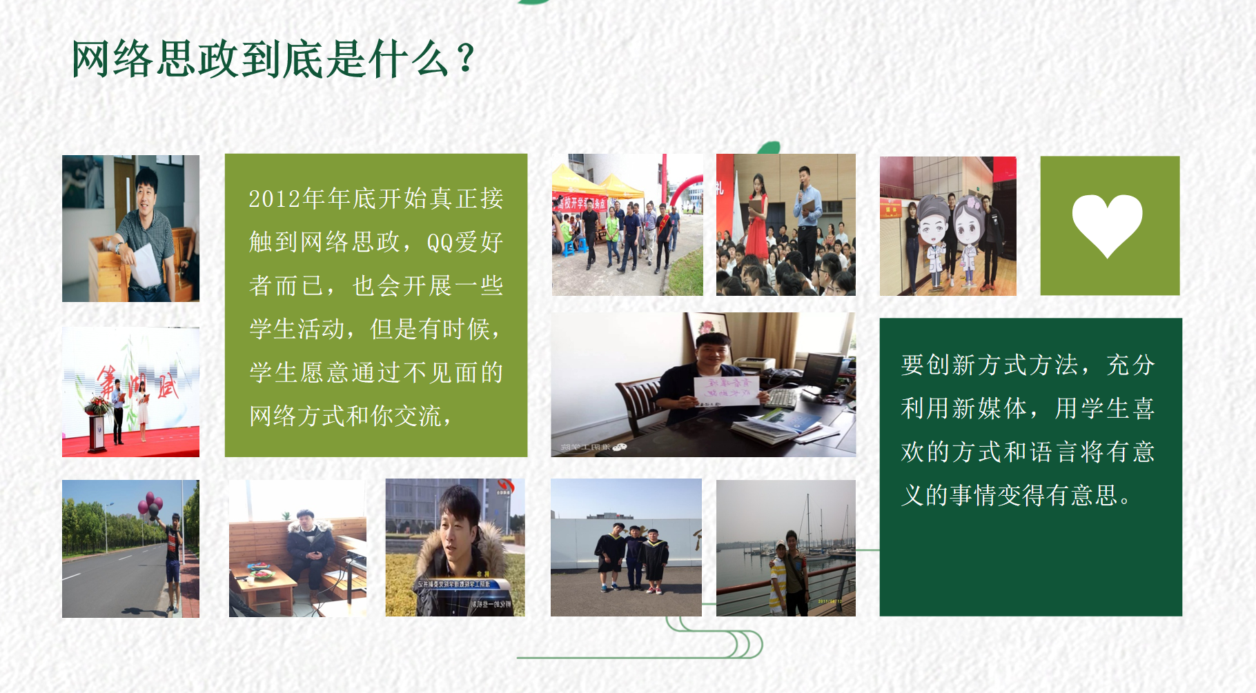 张涵说:做辅导员最初的梦想,就是帮助学生从生活中获得愉悦感和自信感,去填充习惯自卑和胆怯的灵魂,让干瘪的自尊心渐渐饱满起来,网络思政温暖有力助学生健康成长。