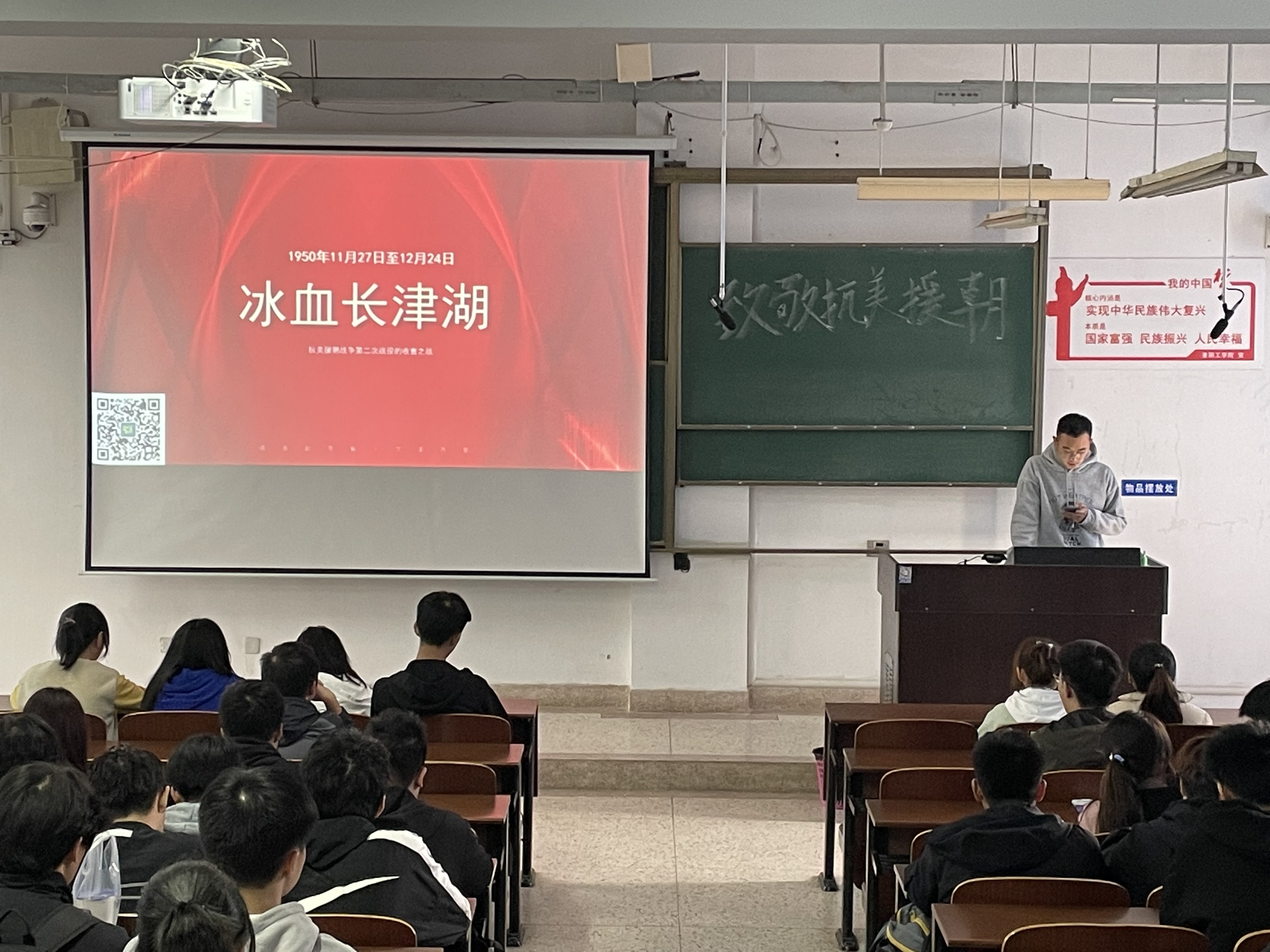 赵莉老师从四个方面具体回忆了长津湖战役的经过:从酷寒战地,紧急调军的作战背景开始,通过装备精良的美军与拥有钢铁般意志的中国军人间的战力对比,详细讲解了歼灭战转为阻击战的战争经过,着重向青马学院展示了战争中超越极限的“血色军魂”。她号召学生们深刻体会抗美援朝精神中的爱国主义精神、革命英雄主义精神、革命乐观主义精神、革命忠诚精神和国际主义精神,将抗美援朝精神发扬光大。