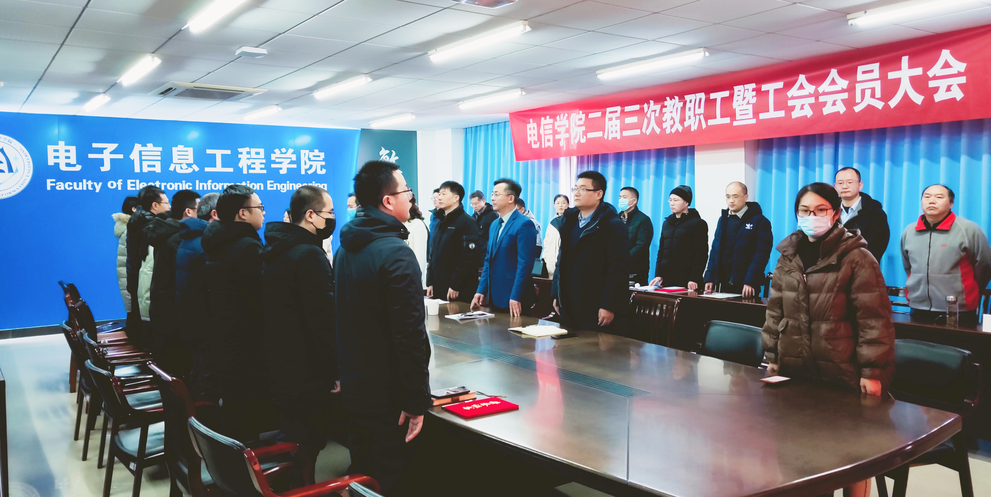在庄严的国际歌声中本次教代会落下帷幕,2021年即将过去,2022年即将来临,电信学院一定会攻坚克难,凝心聚力,团结带领全院师生员工围绕学校中心工作,认真落实校党委布置的各项任务,紧扣学院教学、科研、学科、管理和服务工作,锚定目标抓落实、提高本领抓落实、齐心协力抓落实,全面争先进位,奋力追赶超越,跑出电信学院高质量发展加速度,向党的二十大胜利召开献礼!