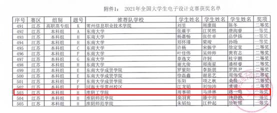 依托淮阴工学院电子协会竞赛指导团队,在2021年全国大学生电子设计竞赛中荣获国赛一等奖,实现历史性突破。依托淮阴工学院发明协会,学生申报专利50余项,在第五届江苏省大学生知识产权知识竞赛中,20位同学荣获优秀奖,我校荣获优秀院校组织奖。本年度获批大学生创新创业训练计划项目42项,荣获国家级奖项9项、省部级奖项71项。