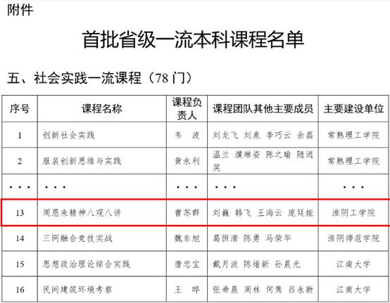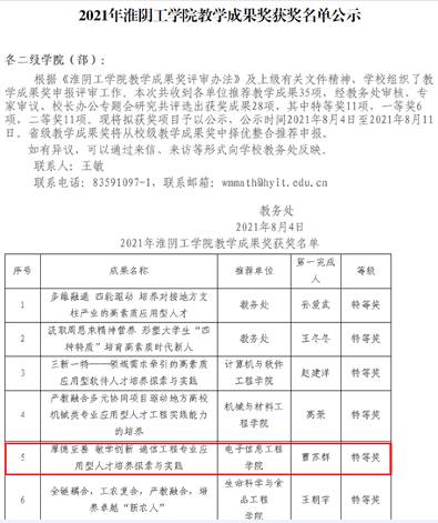 2019年江苏省高等教育教改研究课题重中之重“课程思政指标点分解及案例库建设探索与实践”项目按期结题;教学成果《汲取周恩来精神营养形塑大学生“四种特质”培育高素质时代新人》荣获2021年江苏省教学成果奖(高等教育类)一等奖;教学成果《厚德至善 敏学创新 通信工程专业应用型人才培养探索与实践》荣获2021年淮阴工学院教学成果特等奖。