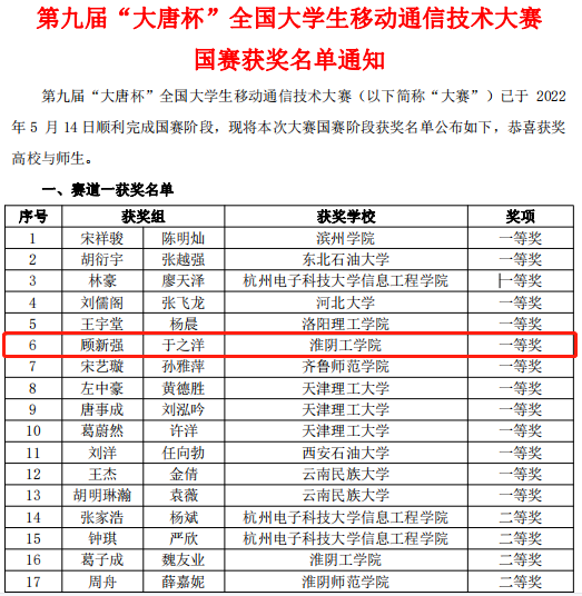 5月25日,第九届“大唐杯”全国大学生移动通信技术大赛结果揭晓,淮阴工学院电信学院在此次国赛中斩获一等奖1项,二等奖1项,三等奖2项的优异成绩。