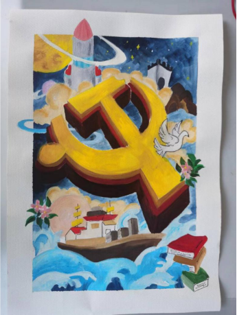 红色作品传递着红色精神,为庆祝中国共产主义青年团成立百年,有的学生手工裁剪了精美的共青团团旗,团旗旗面为红色,象征革命胜利,左上角缀黄色五角星,周围环绕黄色圆圈,象征中国青年一代紧密团结在中国共产党周围,金色的麦穗象征着百年辉煌,寓意着建团百年的累累硕果。这不仅是一种追忆、一种传承,更是在感受一种激情,汲取一种力量,激发了同学们的爱国热情和民族自豪感,并深切感受中华民族从站起来、富起来到强起来的伟大历程。