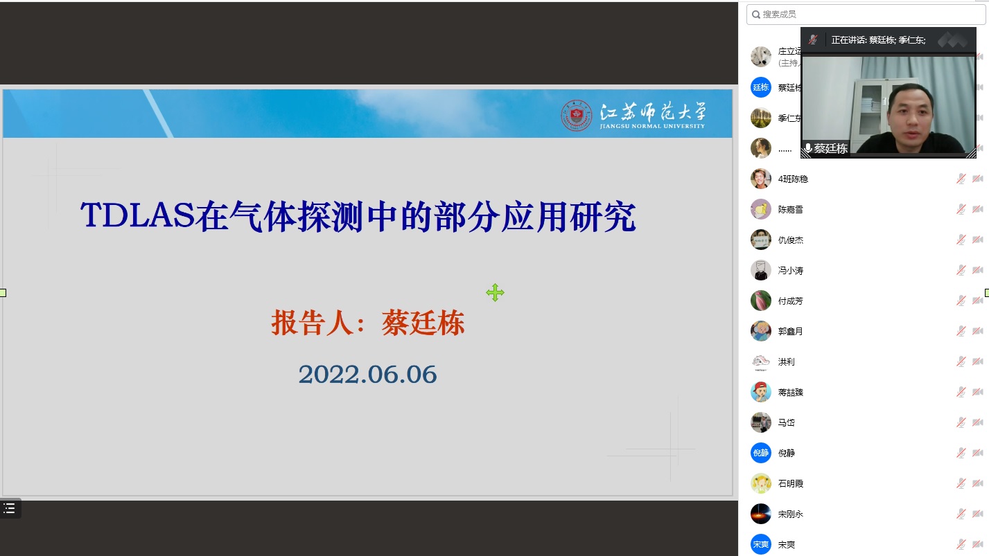 按照学校“科技活动月”活动计划,2022年6月6日下午,江苏师范大学蔡廷栋教授应邀为电信学院师生做题为“TDLAS在气体探测中的部分应用研究”的学术报告,电信学院季仁东副院长主持了报告会。