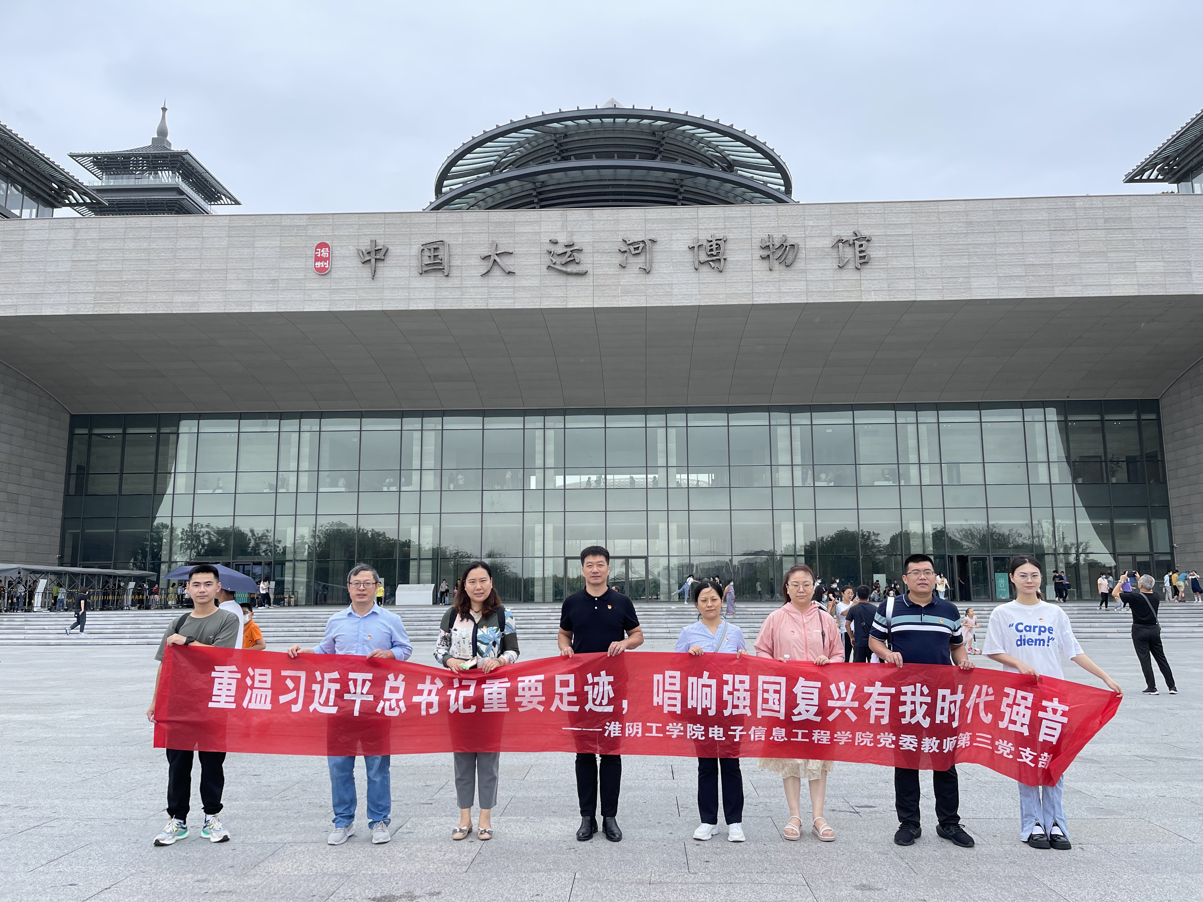 近日,淮阴工学院电子信息工程学院党委前往扬州市运河三湾生态文化公园、中国大运河博物馆和江都水利枢纽展览馆调研,在运河畔进行主题为“重温习近平总书记重要足迹,唱响强国复兴有我时代强音”的思政大课。
