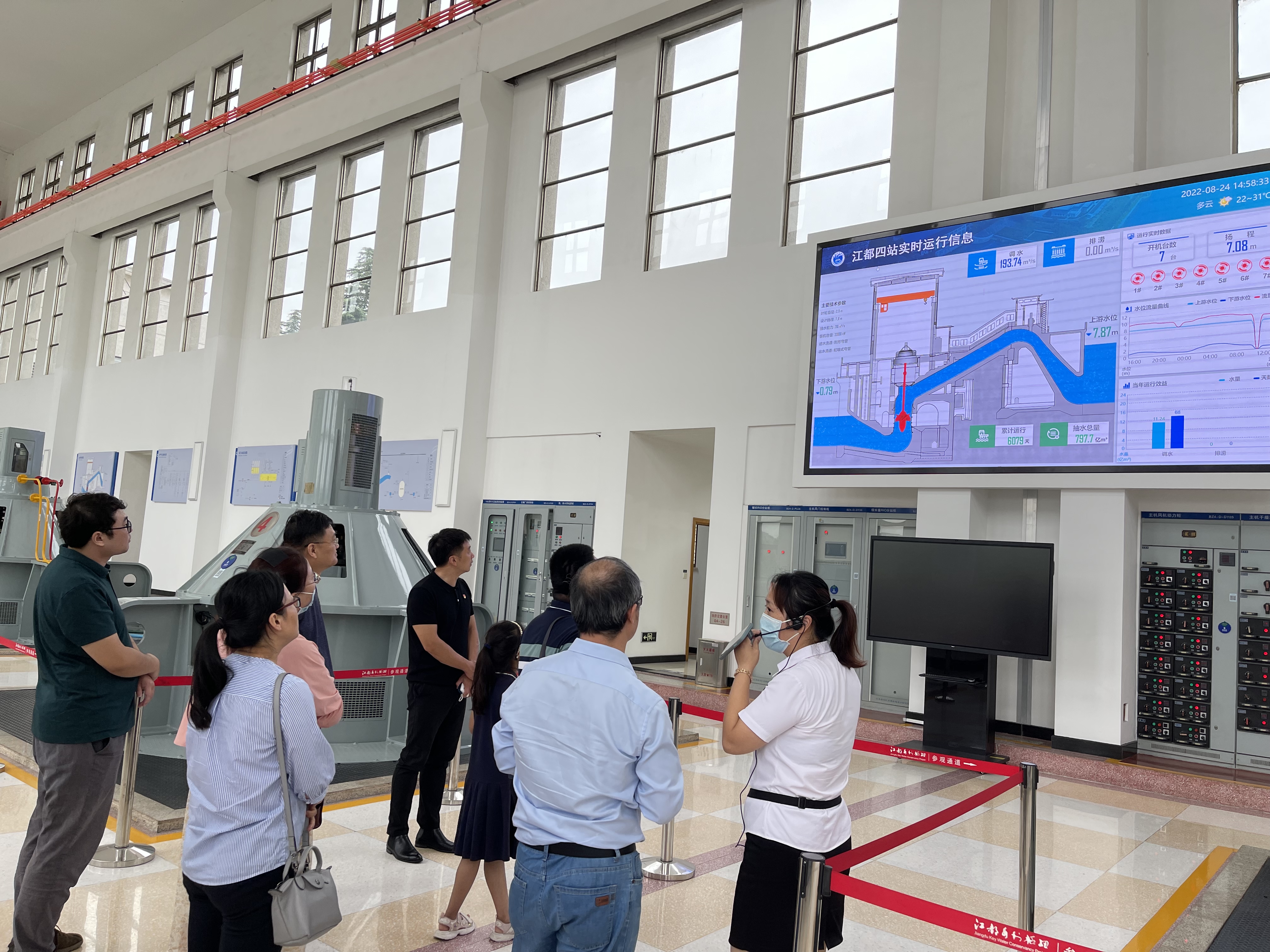 在江都水利枢纽展览馆,党建融建单位江都水利工程管理处介绍了江都水利枢纽工程既是伟大治淮工程的重要节点,又是江苏江水北调的龙头工程,具有灌溉、排涝、泄洪、通航、发电、改善生态环境等综合功能,是我国第一座自行设计、制造、安装和管理的大型泵站群,规划布局合理,设计施工科学,运行管理规范,堪称江苏乃全国治水的典范,被誉为“江淮明珠”,是国家南水北调东线“源头”。