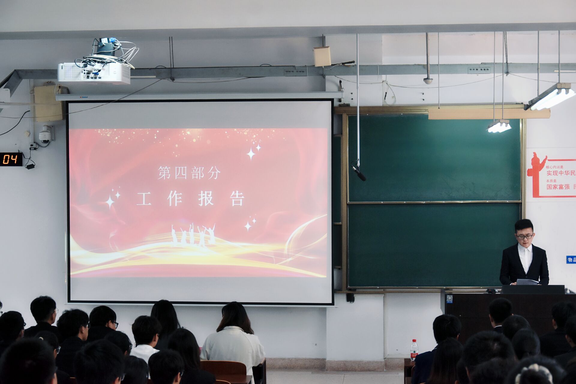 伴随着庄严的国歌声,本次大会拉开序幕,主持人赵浦蕊宣布大会开始并介绍参会嘉宾,机械学院学生会主席团代表吴骏章致贺信。