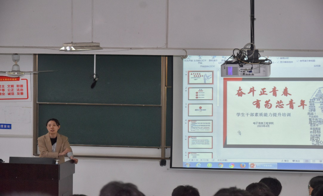 4月12日下午17:00,电信学院于YFJ0103开展第十六期青马工程培训第二讲:奋斗正青春,有为芯青年。电信学院学工办主任王蓉蓉担任主讲,全体青马工程班学员参加本次培训。