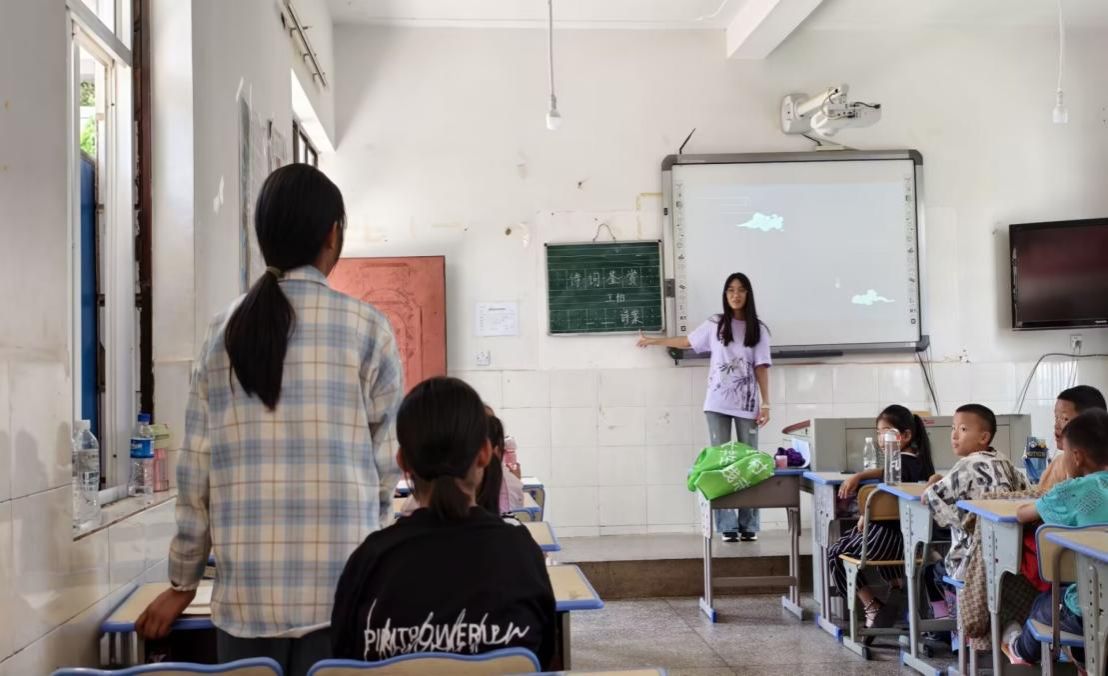 “大——江——东——去——,浪——淘——尽——” 7月21日,云南省大理白族自治州鹤庆县辛屯镇新登小学的教室里,传出阵阵稚嫩却努力的诵读声。讲台上,王怡老师手臂轻扬,仿佛在引导无形的波浪,孩子们挺直腰板,跟着她的手势,一字一顿地模仿着苏轼《念奴娇·赤壁怀古》的磅礴气势。这是淮阴工学院“来自远山深处的力量”第十二季云南支教团推普系列活动的生动一幕。从7月18日到23日,推普的“春风”不仅吹进了课堂,更融入了课后笑语和街头巷尾。