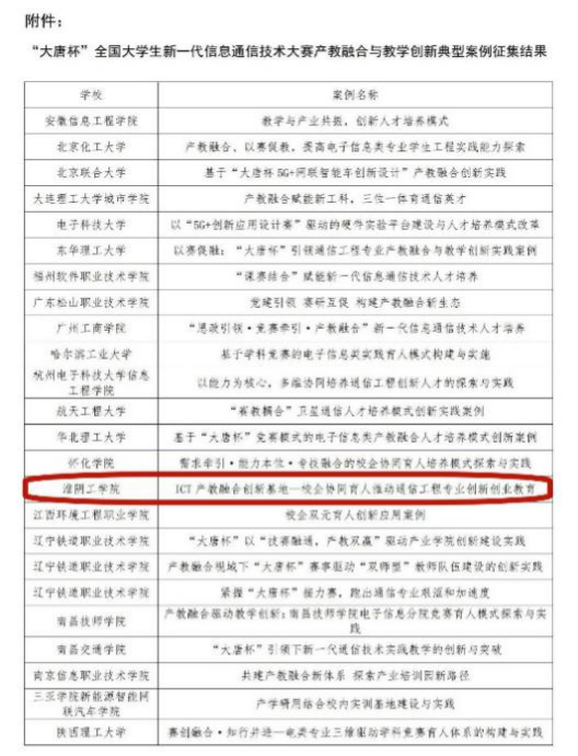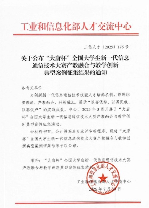 同月30日,从工业和信息化部人才交流中心传来喜讯,我院报送的“ICT产教融合创新基地”案例成功入选“大唐杯”全国大学生新一代信息通信技术大赛产教融合与教学创新典型。该案例彰显了我院通信工程专业在深化校企协同、推动创新创业教育方面的显著成效,是“以赛促教、以赛促产”模式的生动实践。