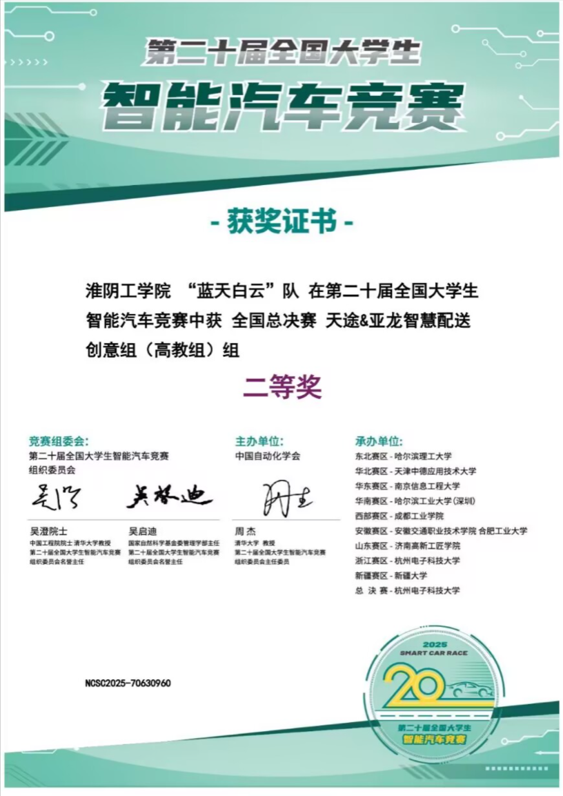 近日,第二十届全国大学生智能汽车竞赛全国总决赛在杭州电子科技大学圆满落幕,我院卞海溢副教授指导的学生团队(陆佳鑫、赵恺华、高宁)摘得智慧配送组全国二等奖,体现了我院师生在智能控制领域的创新实力。